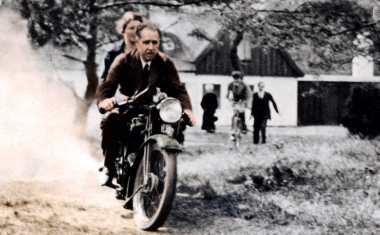 Нильс Бор с женой катаются на мотоцикле, принадлежащем Георгию Гамову. Фото Г. Гамова, середина 1940-х гг.