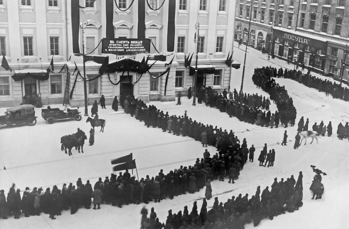 «В Доме Союзов, в Колонном зале — гроб с телом Ильича. Круглые сутки — день и ночь — на площади огромные толпы людей, которые, строясь в ряды, бесконечными лентами, теряющимися в соседних улицах и переулках, вливаются в Колонный зал.