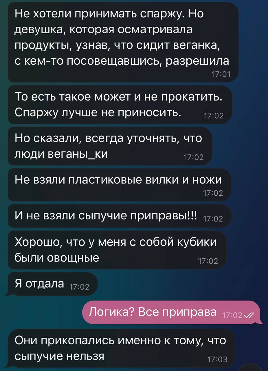 Большая головная боль – это поиск решения, как нам обеспечить подопечных витамином В12, без которого веганам сложно сохранить здоровье. Нам приходится сильно выкручиваться, чтобы отправить в места заключения эту добавку. Фсиновцы часто не пропускают различные БАДы. Мы безуспешно посылали Ивану Кудряшову В12. Он из-за этого в том числе ушел на 40-дневную голодовку. Добавку можно отправить в не стеклянной и не металлической таре с описанием на русском языке и приложить чек. Шанс, что заключенный получит витамины таким образом, небольшой, но все же он есть. Можно купить зубную пасту с В12 или передать веганские сырные дрожжи. Они на вкус как орехи или пармезан и могут быть обогащены В12. В каждом учреждении, входящем в систему ФСИН, свои правила внутреннего распорядка и трактовки их. В "Кресты" нельзя передавать приправы в пакетиках, а только в кубиках. В "Матросской тишине" лекарства можно передавать в определенные дни недели в определенное время. Все эти нюансы мы должны держать в голове, чтобы до арестованных и заключенных дошли посылки. И такое нагромождение и диссонанс правил делают пребывание людей в местах заключения максимально некомфортным. Даже если нам удается передать посылку с нужными вещами и продуктами, то у заключенного их могут отобрать. Например, у нашей первой подопечной Евгении Макаренко, которую в прошлом году приговорили к 11 годам общего режима по обвинению в контрабанде наркотиков, забрали на хранение менструальную чашу. Мне непонятно, почему Евгении отказали в праве пользоваться этим более безопасным для окружающей среды и удобным гигиеническим средством, чем прокладки. Осужденного по делу "Сети" Андрея Чернова постоянно прессуют в колонии. Он часто попадает в ШИЗО, куда ему не дают брать веганскую еду.