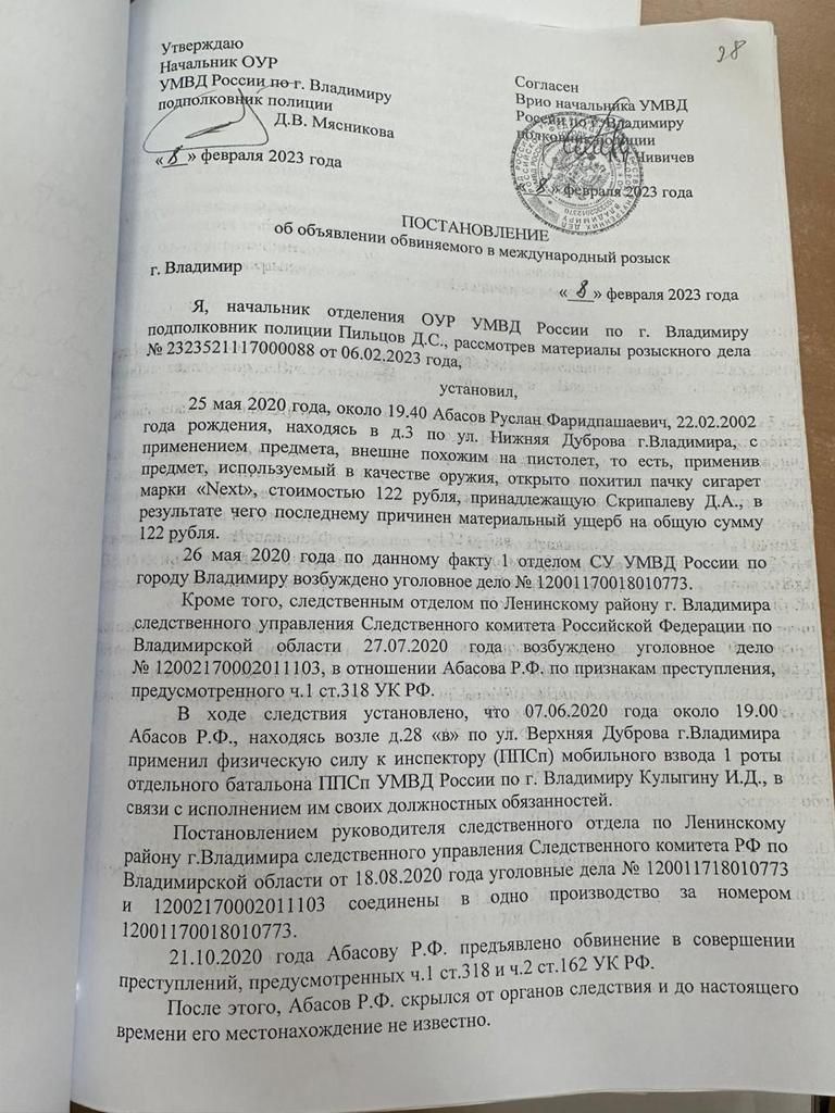 Вместе с тем, новое уголовное дело в отношении Абасова также возбудили в России, суд во Владимире заочно арестовал его. Теперь Абасову вменяют разбой (ч. 2 ст. 162 УК) и нападение на полицейского (ст. 318 УК). Абасов считает эти обвинения сфабрикованными. Материалы уголовных дел имеются в распоряжении «Довода».