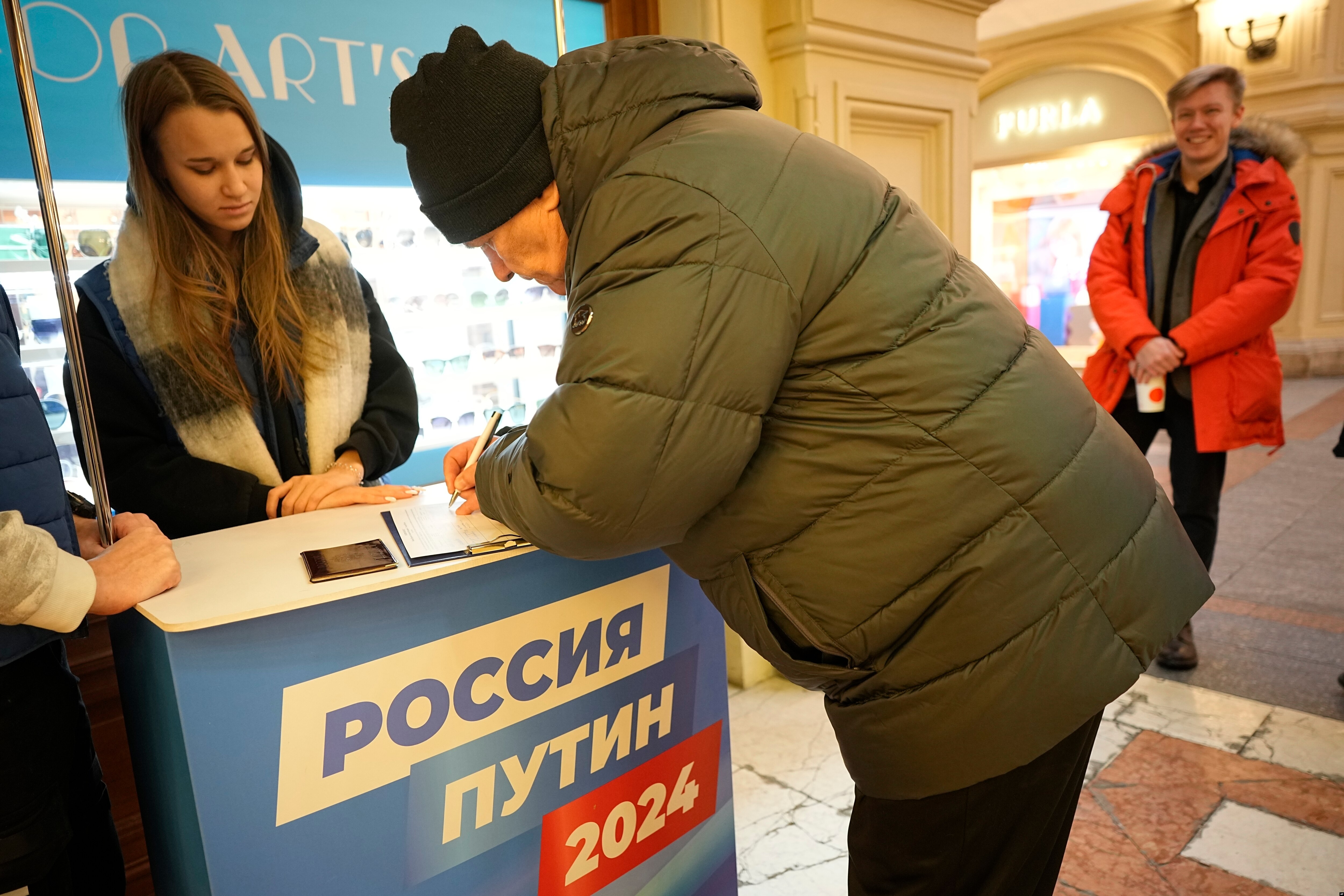 Тем временем, как стало известно 22 января, ЦИК РФ официально принял документы для регистрации Путина в качестве кандидата на президентских выборах в предстоящих президентских выборах. В Центризбирком были доставлены 95 коробок с 315 тыс. подписей в поддержку Путина. По словам сопредседателя штаба, актёра Владимира Машкова, собрано в 10 раз больше подписей, чем необходимо при самовыдвижении по закону.