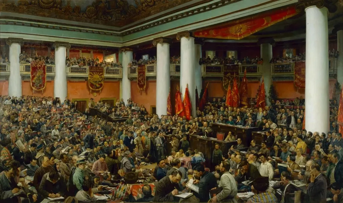 Вот это — знаменитая когда-то картина с очень длинным названием: «Торжественное открытие конгресса Коминтерна во дворце Урицкого в Ленинграде» художника Исаака Бродского, посвященная реальному событию июля 1920 года.