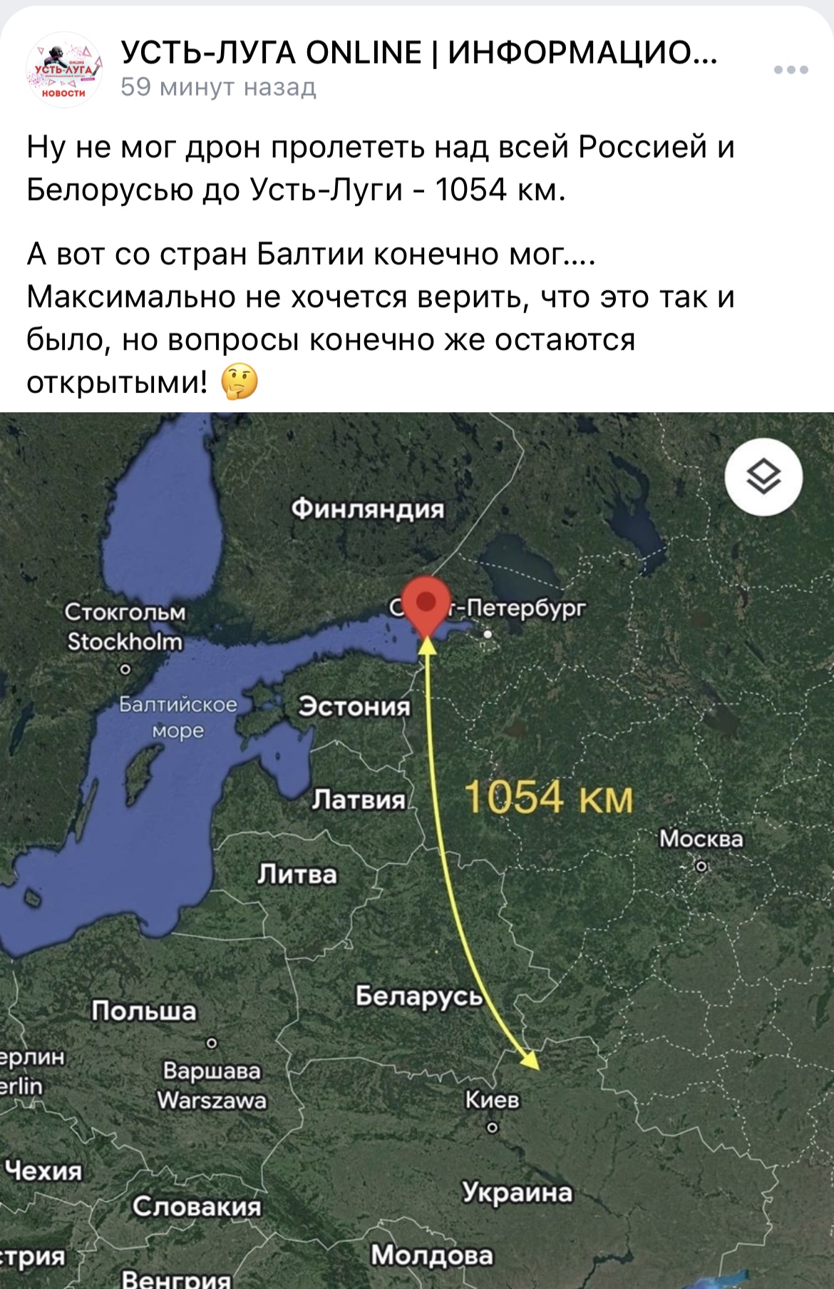 Если БПЛА были запущены с территории Украины, то получается, что они пролетели более тысячи километров. Такие расстояния преодолевают только дроны-разведчики, но не ударные дроны. В соцсети Усть-Луги рассуждают, что беспилотник летел со стороны стран Балтии. "А если бы целью был не порт, а наш город? – задаются вопросом местные жители. – Страшно. А у нас в таком случае нет бомбоубежищ, и подвалы все затоплены и под замком".
