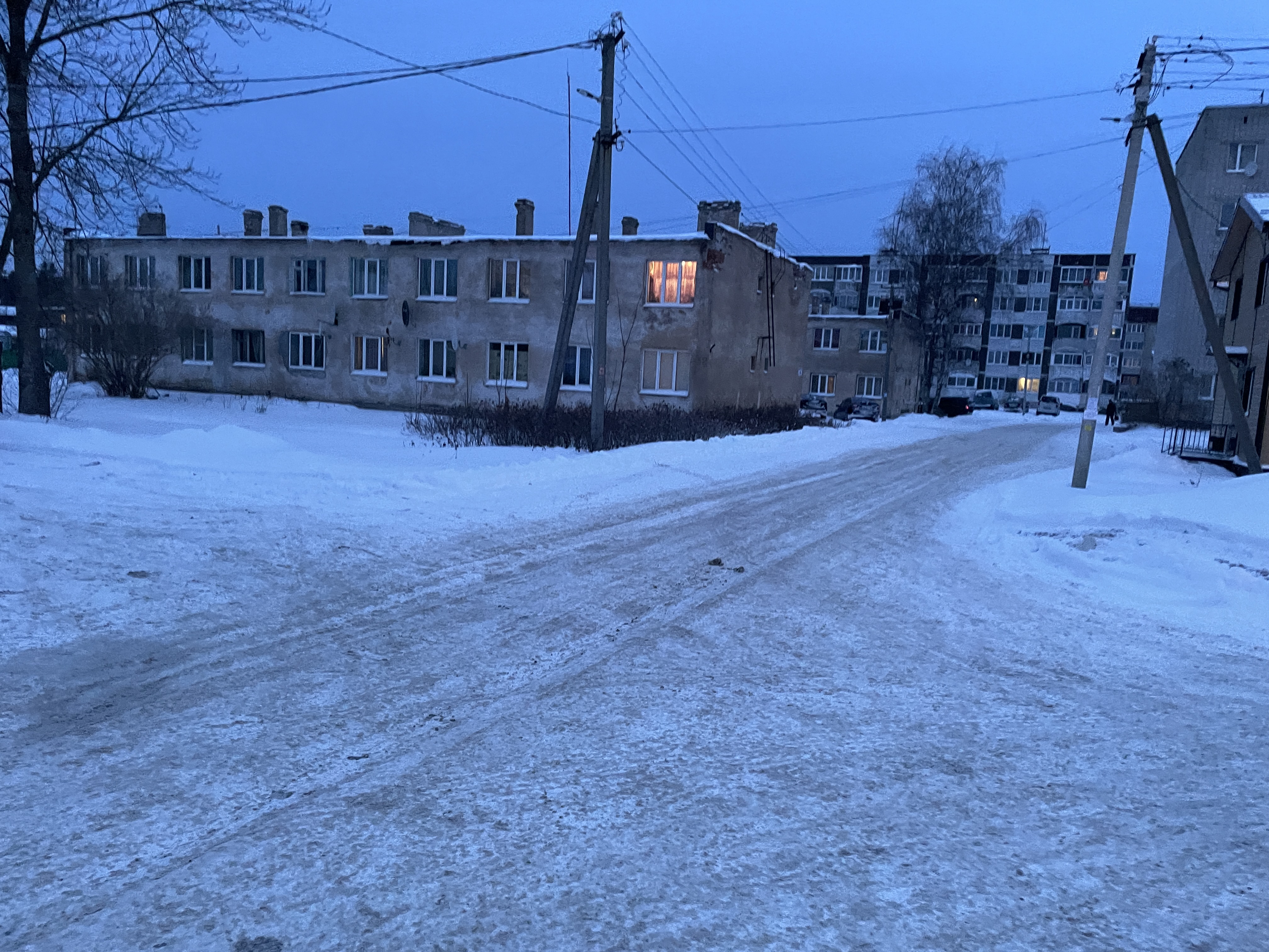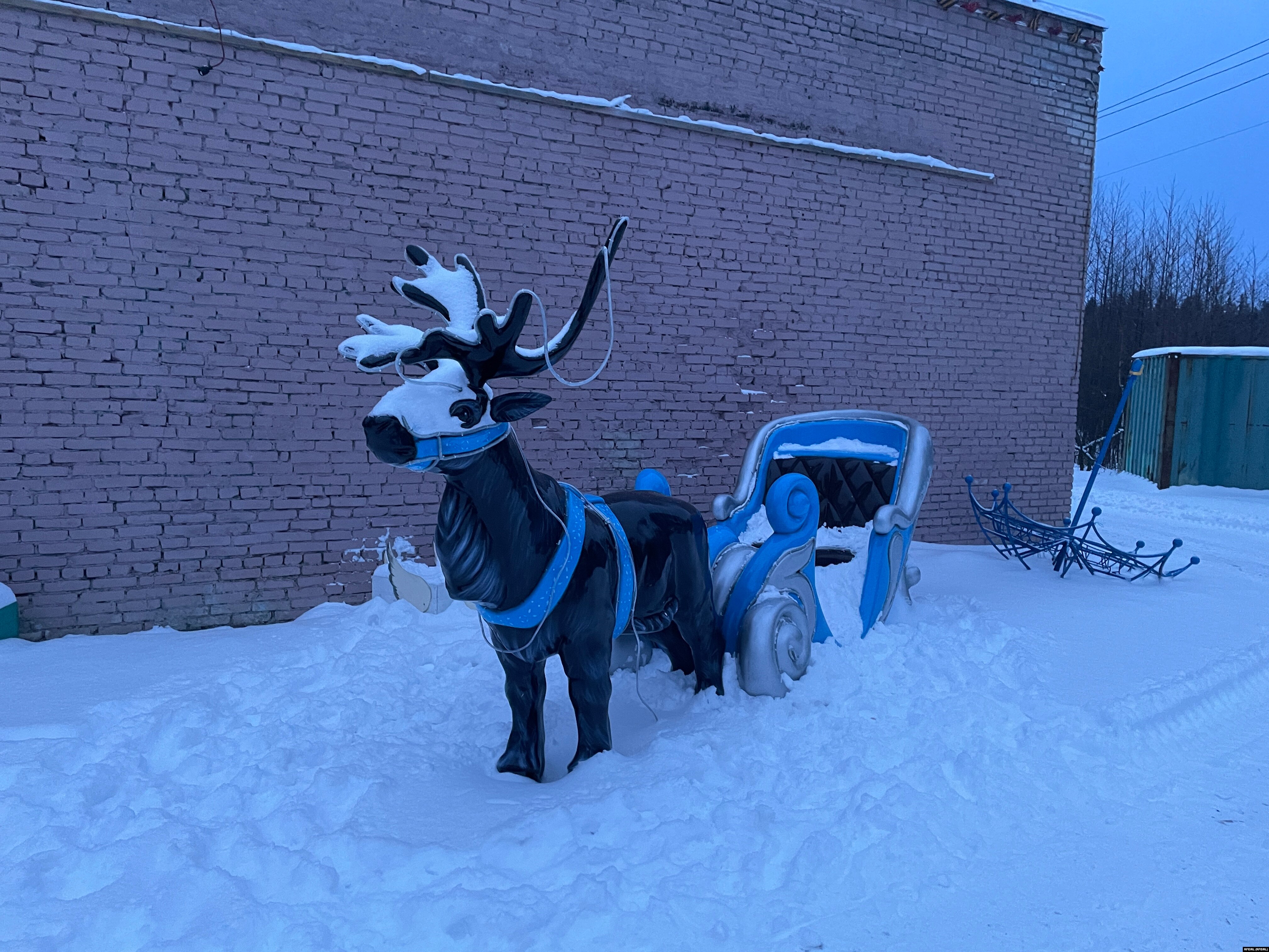 Рядом с продуктовым большая детская площадка, тоже пустая. Мимо пробегают два паренька, и, игнорируя расчищенную игровую зону, бросаются в сугроб напротив и карабкаются дальше. За площадкой стоит старый дом культуры, на его задворках потрепанный реквизит к новогородним праздникам: сани с оленем, ель, белые медведи и стенд с надписью "Я люблю Усть-Лугу".