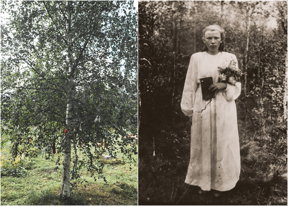 Слева: место разрушенной часовни Святой Параскевы, деревня Ильеши. Справа: Айно Коло, мама Эльзы Дмитриевой. Тайная конфирмация в лесу, 1952 годФото: Ольга Матвеева Когда немцы оккупировали деревни, они взяли с собой только маленькие Библии и песенники на финском. Немцы не отбирали. Они видели, что эти люди очень дорожат этими книжками с крестиками.