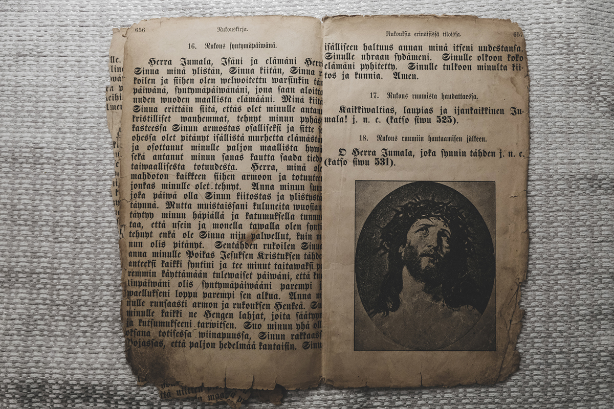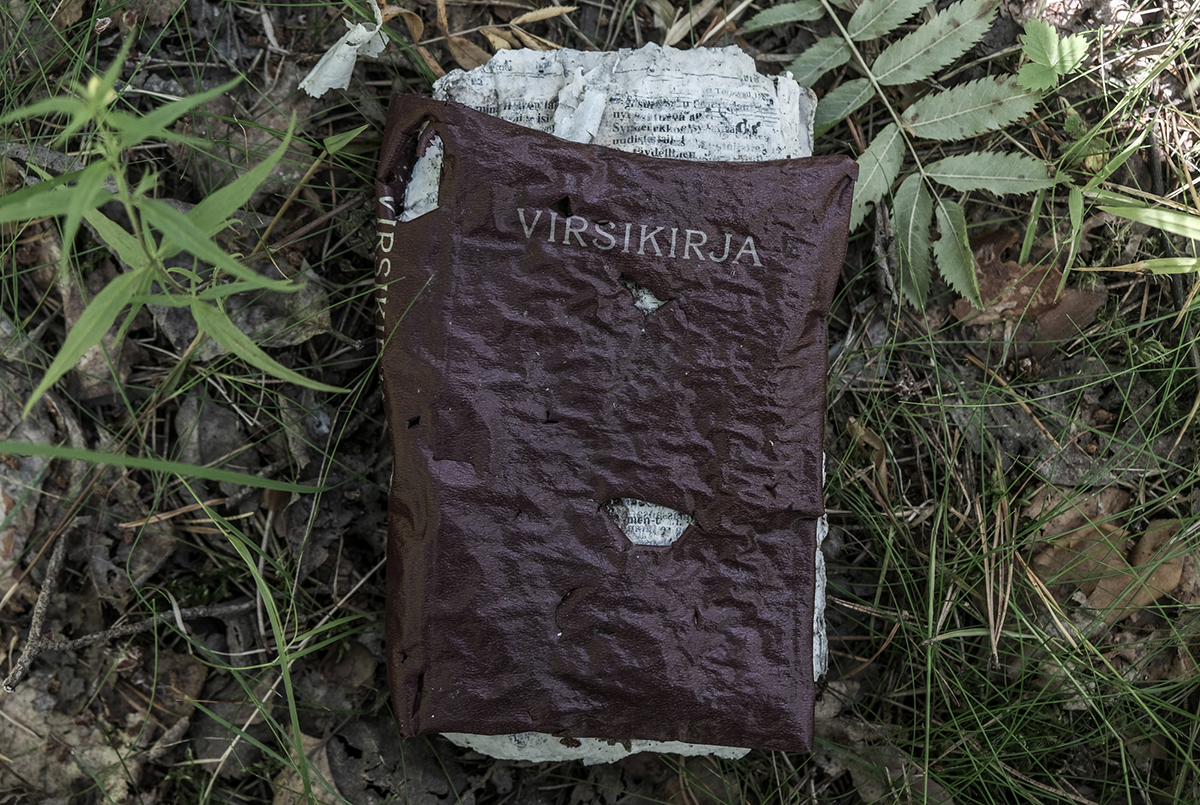 Финский молитвенный песенник. Найден у креста в память о разрушенной церкви на территории бывшей деревни Нижние НикулясыФото: Ольга Матвеева Для фотосъемки я использовала две камеры — цифровую и аналоговую. У меня было пять катушек просроченной цветной пленки. Так в проекте получились две основные линии. На цифровых снимках вы увидите ту реальность, с которой мы сравнивали снимки Самули. А на старой пленке — то, что я чувствовала, пытаясь запечатлеть утраченную реальность. На них нет глубины резкости, четких линий, ярких цветов, а лишь едва видимые очертания людей, церквей, пейзажей, той самой земли, того самого народа, память о котором такая же зыбкая и исчезающая.