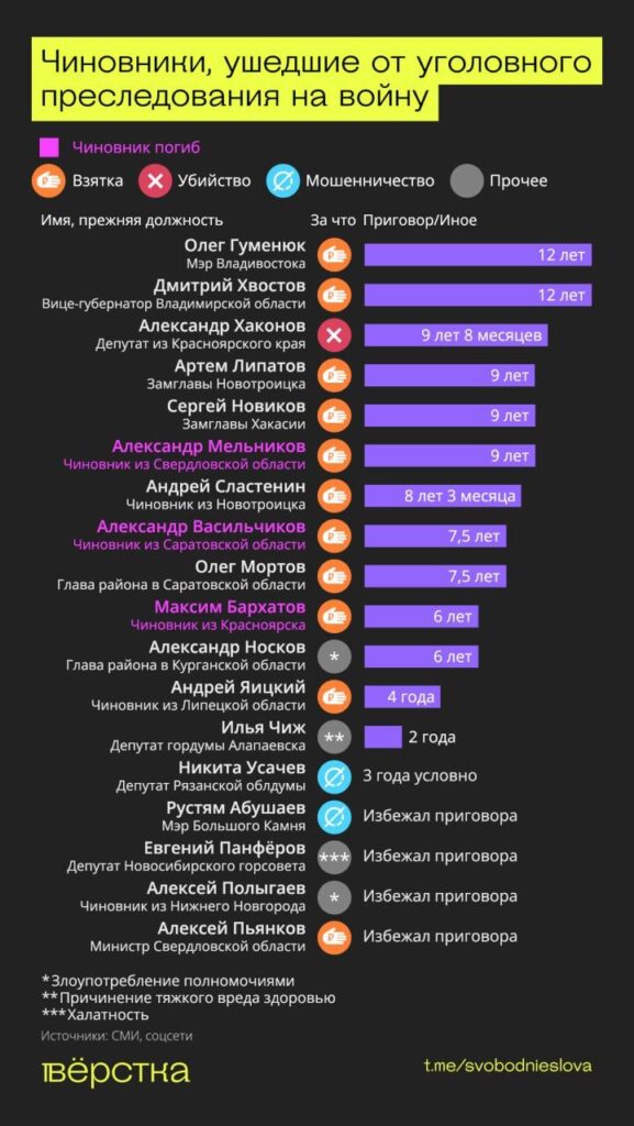 Самые крупные сроки, которых удалось избежать чиновникам, были назначены экс-мэру Владивостока Олегу Гуменюку и бывшему вице-губернатору Владимирской области Дмитрию Хвостову — по 12 лет колонии. Гуменюку вынесли приговор в январе 2023 года, а уже в январе 2024 стало известно, что он уехал на войну. Хвостова приговорили в июле 2020 года, а в мае 2023 года была опубликована (https://t. me/vladimir_tract/577) фотография экс-чиновника в военной форме.