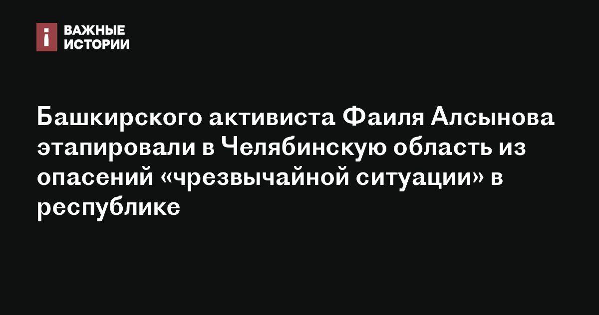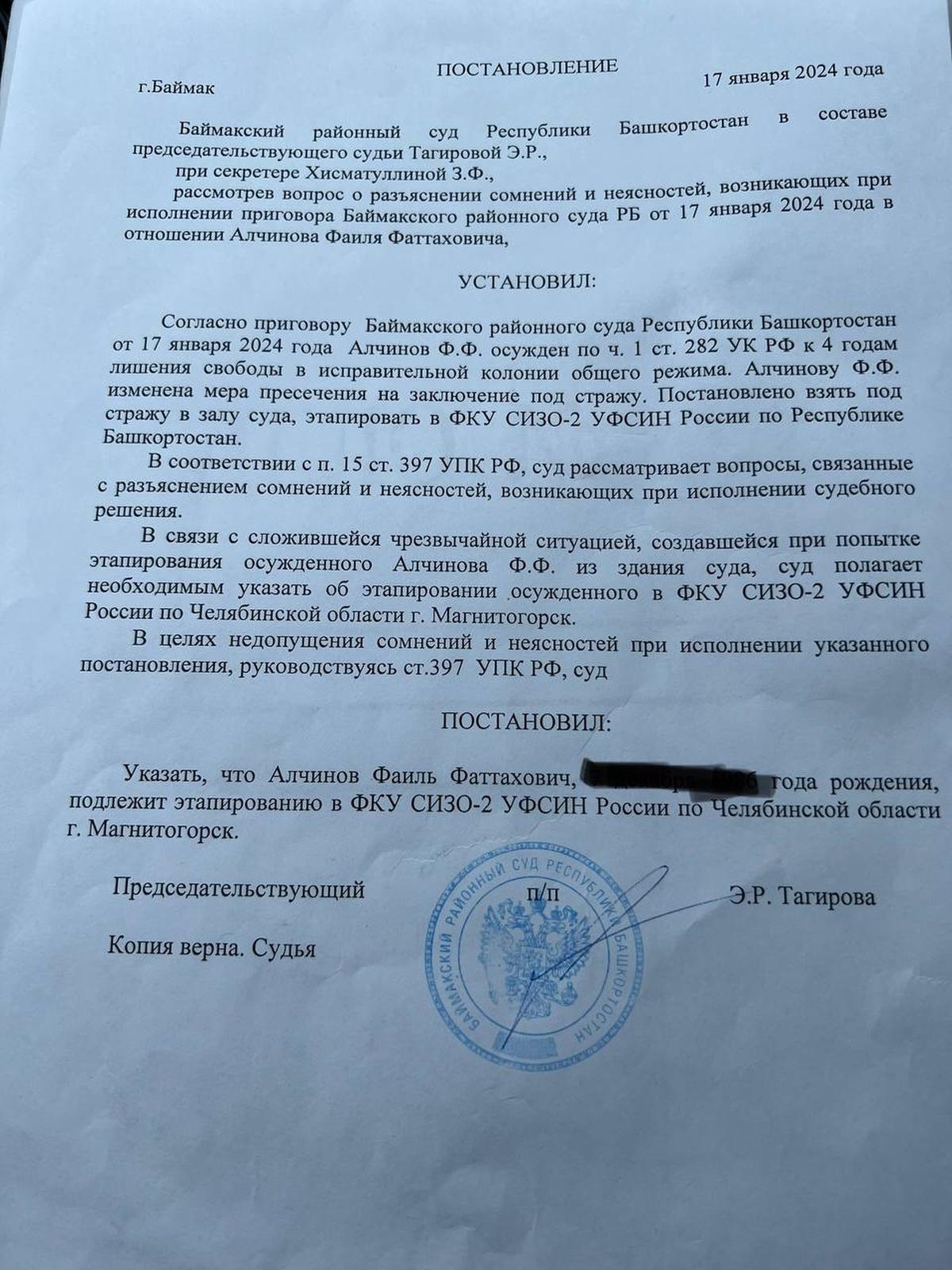 Баймакский районный суд постановил этапировать приговоренного к четырем годам колонии активиста Фаиля Алсынова из Башкортостана в Челябинскую область, опасаясь напряженности в регионе. Это следует из копии постановления судьи, которую опубликовал адвокат активиста Ильнур Суюндуков.