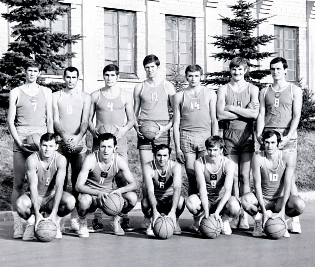Олимпийская сборная команда СССР по баскетболу, 1972 г. Сидят (слева направо): Модестас Паулаускас, Михаил Коркия, Зураб Саканделидзе, Иван Едешко, Сергей Белов. Стоят: Алжан Жармухамедов, Геннадий Вольнов, Анатолий Поливода, Сергей Коваленко, Александр Белов, Иван Дворный, Александр Болошев. Фото: Вячеслав Ун Да-син / Фотохроника ТАСС
