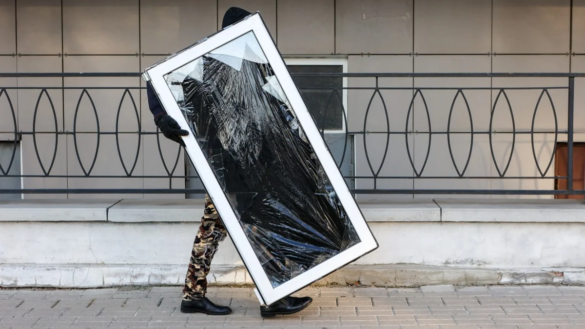 Житель Белгорода меняет поврежденное от обстрелов стекло. Фото: Евгений Силантьев / ТАСС