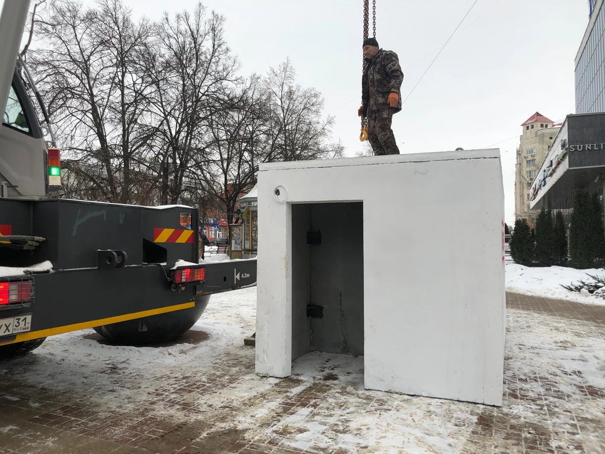 Сооружать укрытия в Белгороде активно начали 15 января. По местному телевидению об этом объявили именно так: укрытия. Во множественном числе. Возле универмага «Белгород» подъемный кран опустил на тротуар белую бетонную конструкцию.