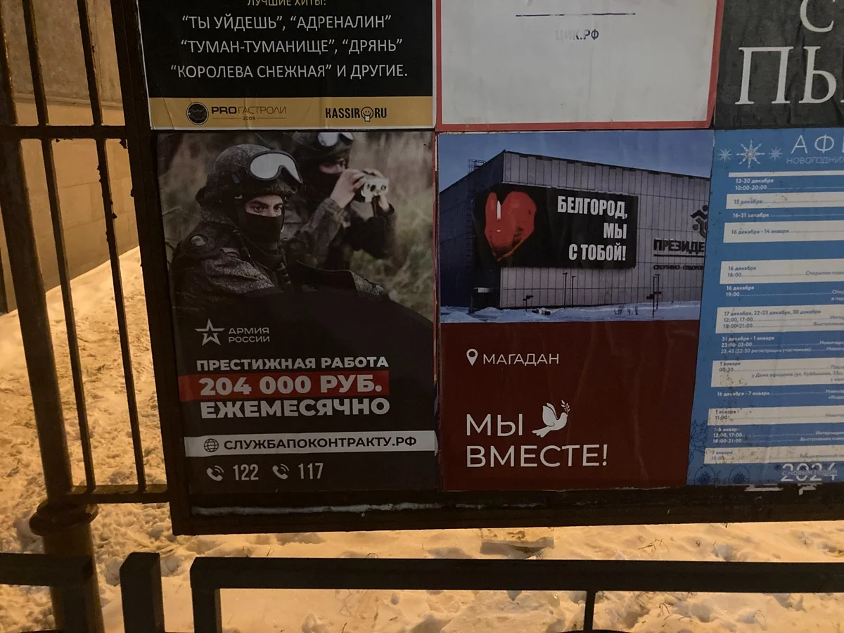 Они уезжают, приезжают, закупаются в магазинах, сидят в ресторанах, для белгородцев «участники СВО» стали деталью ландшафта. Такой же привычной, как афишные тумбы, на которых теперь наклеены призывы зарабатывать нашивки на рукав и 204 тысячи рублей в месяц.