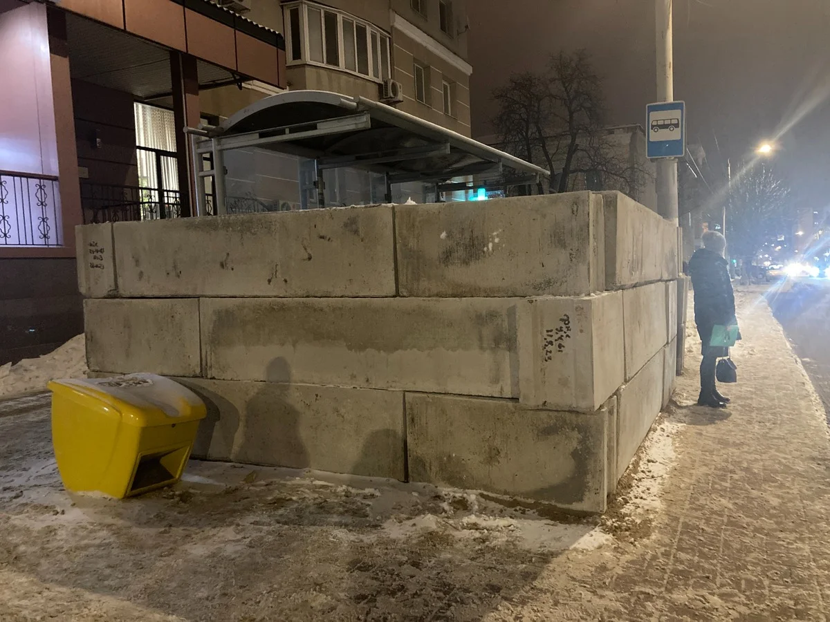 Строго говоря, укрытие единственным не было. В центре Белгорода автобусные остановки обложили бетонными блоками и мешками с песком. Если считать, что снаряды не будут лететь сверху, то эти блоки смогут кого-нибудь укрыть. На одной остановке мешки с песком попадали и выдавили стекла.
