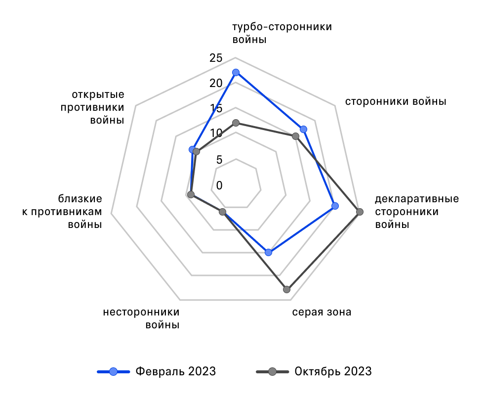 В предыдущей публикации мы описали несколько фаз изменения отношения к военным действиям и остановились на фазе «погружения в войну», осознания обществом ее длительности и непреодолимости, пришедшегося на прошлую зиму. В 2023 году основным трендом стали рутинизация или вытеснение войны. Важной частью этого феномена, как сказано выше, являются сокращение доли реальных сторонников войны и снижение «слышимости» провоенной позиции в обществе, своего рода демобилизация общества весной–осенью 2023 года.