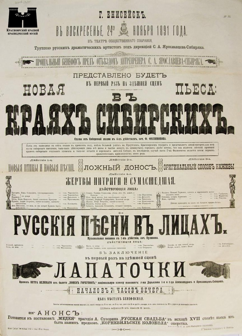 Так происходило не только в Красноярске. В каком бы сибирском городе ни показывали этот спектакль, местные губернаторы сразу узнавали себя в главном отрицательном персонаже и также требовали пьесу запретить. В итоге Теляковский и его коллеги из Иркутска и Томска потребовали удалить пьесу со сцены, а Филимонова сослать в Якутию.