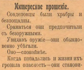 "Совдеповцы были храбры и беспощадны. Сражаться они предпочитали с безоружными. Увидев оружие, они обыкновенно убегали. Оно – спокойнее.