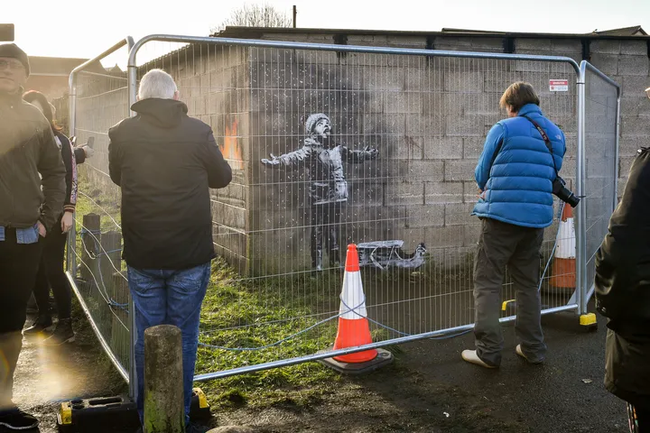 Изображение появилось в конце 2018 года в британском городе Порт-Толбот на углу обычного гаража. Время праздников — ребенок ловит ртом снежинки, рядом санки, сплошная идиллия, но это лишь часть высказывания Бэнкси. С другой стороны стены мы видим горящий мусорный бак, значит мальчик стоит в облаке пепла, а не снега. Порт-Толбот — крупный центр черной металлургии, а местный сталелитейный завод серьезно загрязняет воздух города. Примечательно, что цветных элементов во фреске всего два — огонь и язык ребенка.
