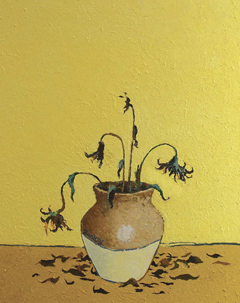Еще один экспонат с выставки «Сырая нефть» — аллюзия на «Подсолнухи» Ван Гога. Однако в версии Бэнкси цветы давно завяли из-за разных аспектов деятельности человека, которая день за днем делает жизнь на Земле все более непредсказуемой и опасной.