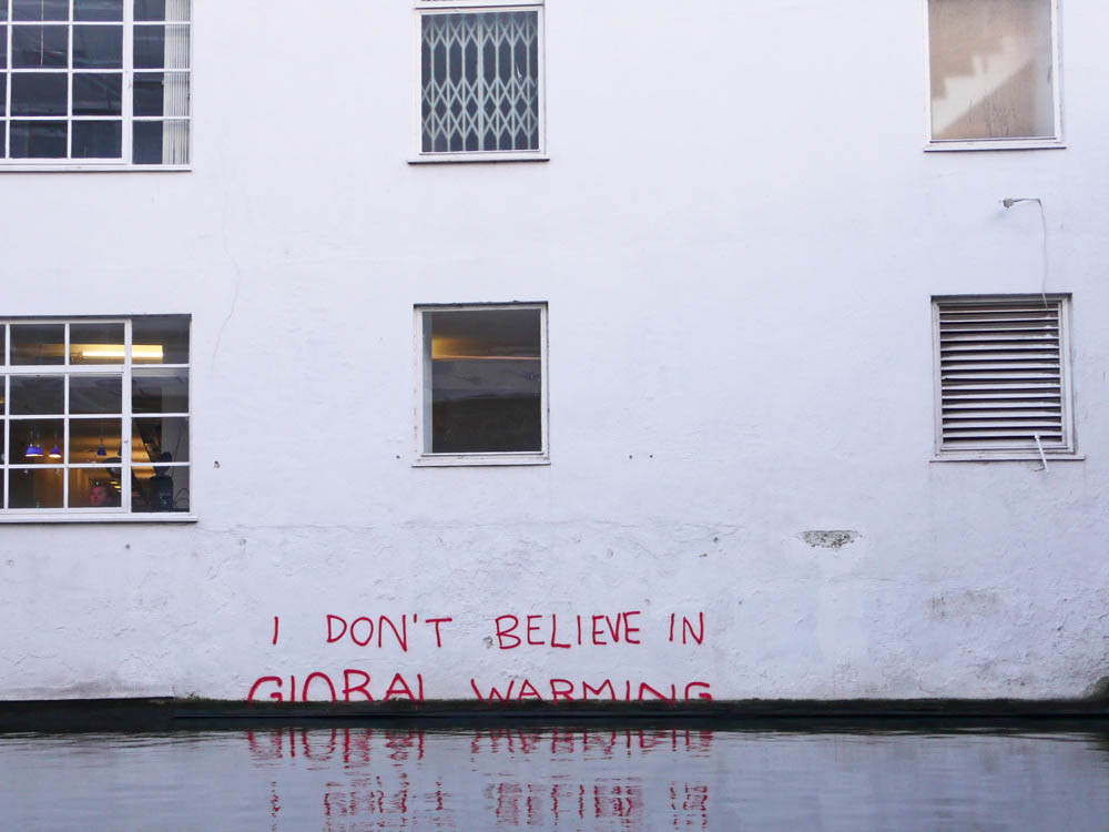 В 2009 году на стене возле Риджентс-канала на севере Лондона огромными красными буквами Бэнкси сделал надпись «Я не верю в глобальное потепление», которая частично скрывается под водой. Поводом для высказывания стала климатическая конференция COP15 в Копенгагене. Тогда принятое по ее итогам соглашение оказалось недостаточно амбициозным для борьбы с изменением климата.