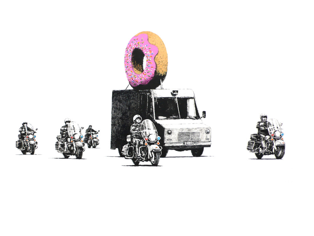 Сатира в этом изображении 2009 года нацелена одновременно на лидеров США, ленивых полицейских, корпорации быстрого питания и общество потребления в целом. Колонна с серьезными мотоциклистами, охраняющими пончик, напоминает кортеж, который обычно сопровождает глав США. А сам пончик — символ потребительства западного общества и американских полицейских, изображаемых в кино того времени.