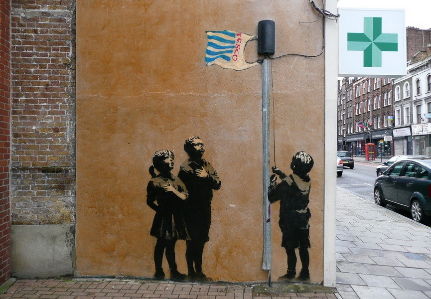 Фреска «Very Little Helps», также известная как «Флаг Tesco», появилась в 2008 году на торце аптеки на Эссекс-роуд в Лондоне. Бэнкси изобразил детей, присягающих на верность британской сети супермаркетов Tesco — аналогу российской «Пятерочки». Один ребенок поднимает пластиковый пакет Tesco вместо флага, а двое других прижимают руку к сердцу, присягая на верность этому символу капитализма. Название «Very Little Helps» — оммаж на слоган компании «Every little helps». Бэнкси осуждает Tesco за вытеснение других брендов с улиц Великобритании, то есть за исчезновение разнообразия и независимости.