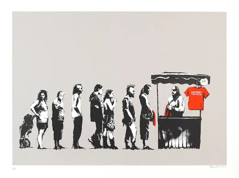 Панки, готы и хиппи — те, кого большинство считает антикапиталистами, — выстроились в очередь, чтобы купить футболку с надписью «Уничтожить капитализм». Конечно, лозунг соответствует взглядам пришедшей на фестиваль аудитории, однако сам акт покупки противоречит главным ценностям представителей этих субкультур. Картина-символ силы капитализма, с которой не могут бороться даже его ярые противники.