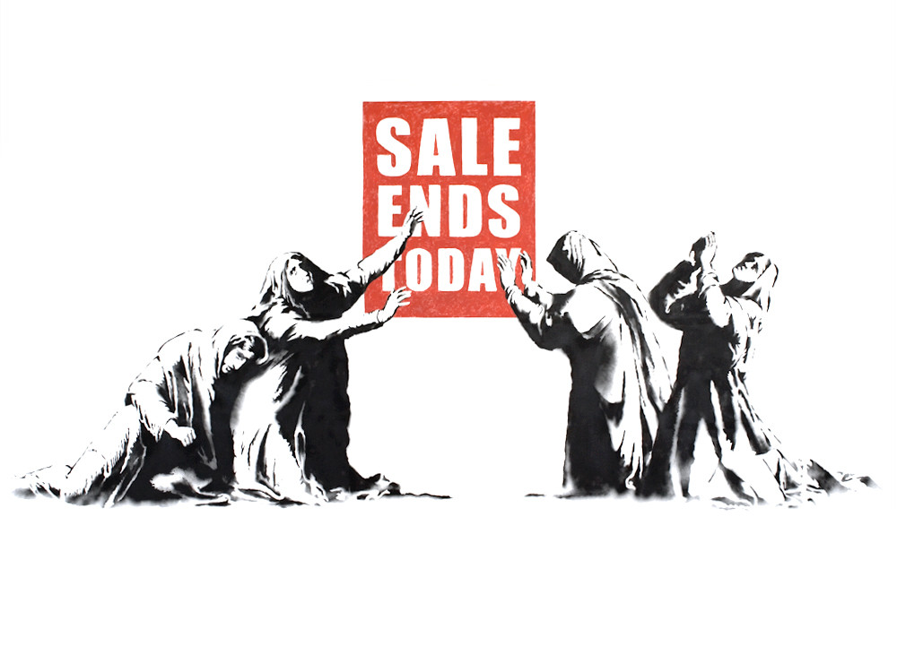 Очередная насмешка над обществом потребления и коммерческими брендами. Пародия на сцены оплакивания Христа с картин эпохи Возрождения. При этом магазинная вывеска красноречиво занимает место самого Иисуса. В этой работе Бэнкси указывает на почти религиозный пыл, с которым люди сегодня относятся к шоппингу. Женщины одновременно и оплакивают последний день продаж, и поклоняются торговым центрам.
