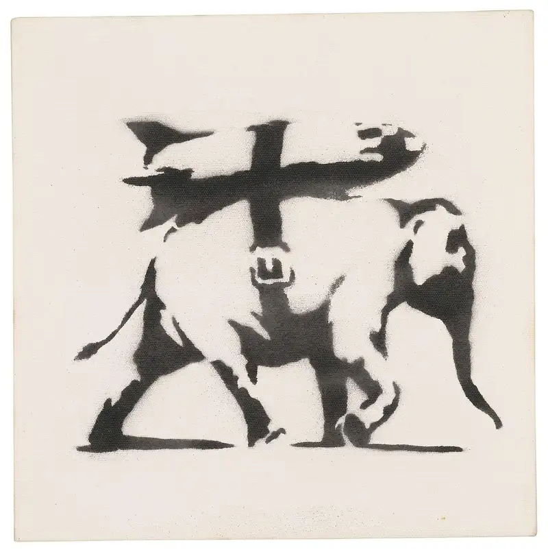 Слон с ракетой на спине — образ, символизирующий военно-промышленный комплекс, который несет беды не только людям, но и природе. В 2013 году Бэнкси подарил копию «Тяжелого вооружения» известному защитнику окружающей среды, актеру Леонардо Ди Каприо. Художник поместил изображение на деревянную подложку, напоминающую ящик, дополнив его надписями «Хрупкое» и «Защита от всех видов непогоды». Эта работа и произведения других мировых художников были проданы на аукционе Christie’s в Нью-Йорке в 2013-м и собрали более 38 миллионов долларов для фонда Ди Каприо.
