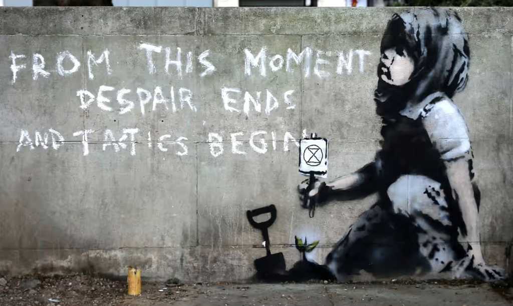 Климатическое высказывание Бэнкси 2019 года неподалеку от лондонского Гайд-парка. Девочка сидит на земле рядом с саженцем, но в руках держит табличку с логотипом движения Extinction Rebellion, которое выступает против климатических изменений, потери биоразнообразия и рассказывающем о рисках социально-экологического коллапса. Логотип в форме песочных часов — символ вымирания, а цитата взята из книги «Революция повседневной жизни» Рауля Ванейгема. Фреска появилась сразу после лондонских протестов Extinction Rebellion в 2019 году.