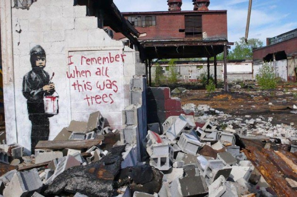 Детройт, руины автомобильного завода Паккард. Бэнкси отметился здесь в 2010 году и напомнил, что на месте всех наших городов, промышленных концернов и всевозможных построек когда-то была нетронутая природа.