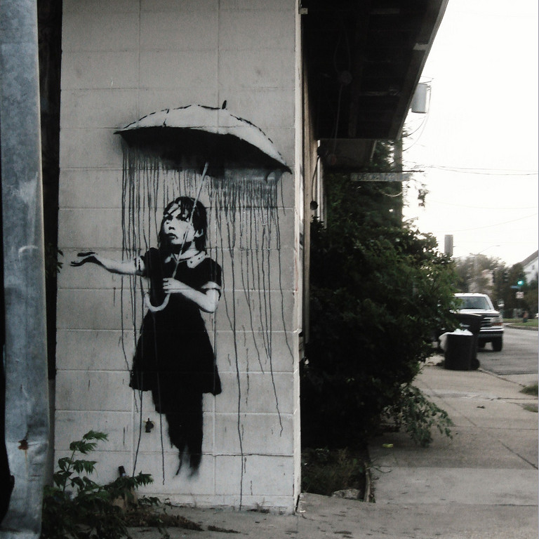 Фреска появилась в 2008 году в Новом Орлеане, серьезно пострадавшем от урагана Катрина в 2005-м. Зонт, который должен защищать девушку от непогоды, наоборот — становится источником осадков. Этот образ указывает на несостоятельность государственных институтов, на совести которых оказались катастрофические разрушения и человеческие жертвы. В момент прихода Катрины защитные сооружения Нового Орлеана не справились с наводнением — правительство сэкономило деньги на их постройке, 80% города оказалось затоплено.