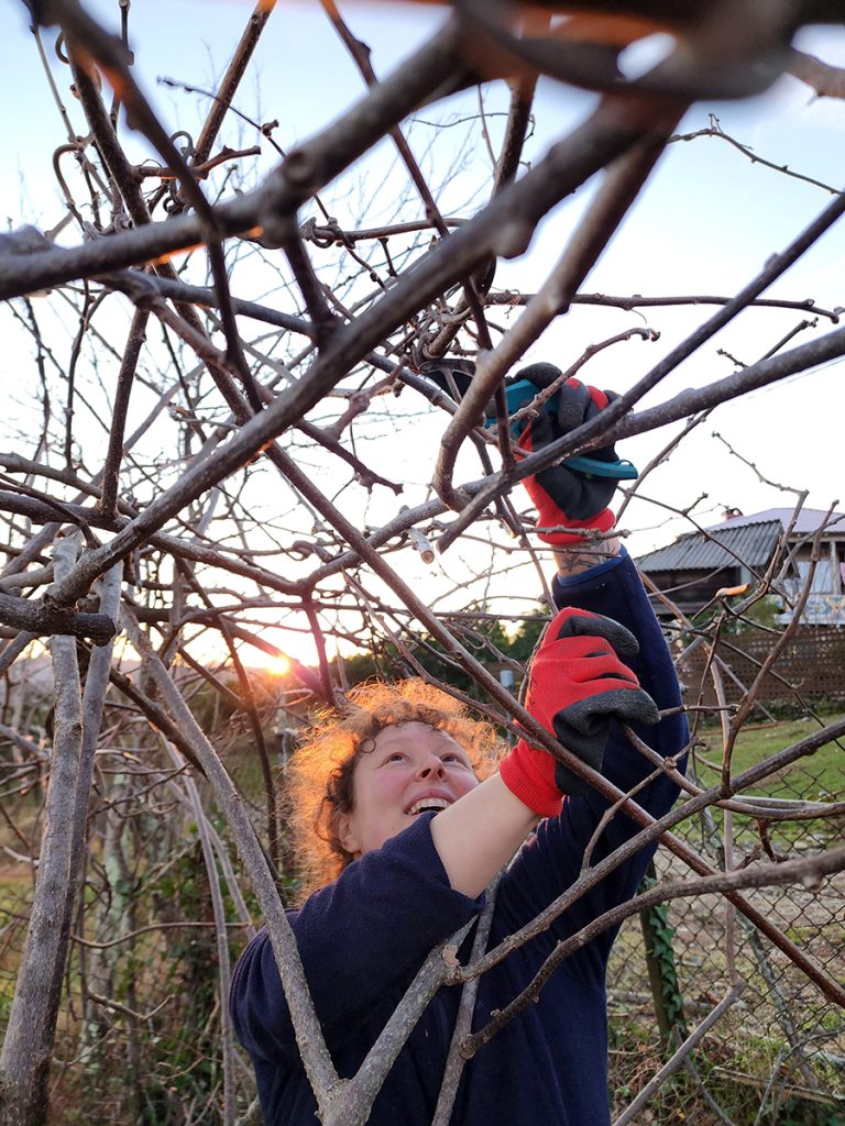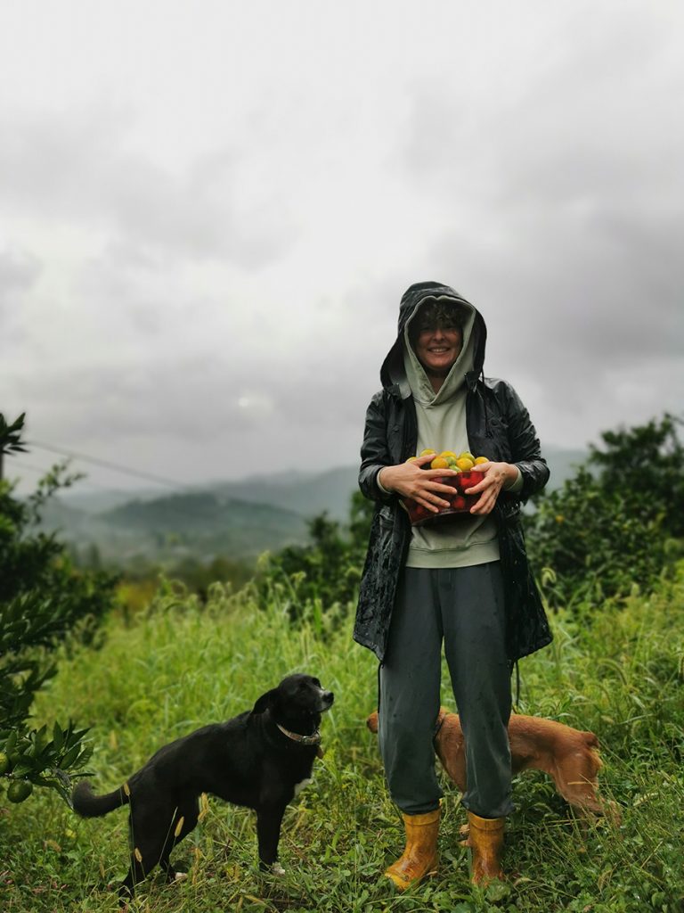 Даша живет в Дэде со своей девушкой Викой и собаками: ремонтирует дом, собирает каштаны, варит мандариновое варенье, принимает гостей и пытается выстроить новое общественное пространство. Мы разговариваем с ней «под курицей» — так Даша называет беседку под бывшим зернохранилищем. Она раздает гостям Дэды секаторы для работы в саду и рассказывает, как сбор мандаринов стал неотъемлемой частью ее жизни.