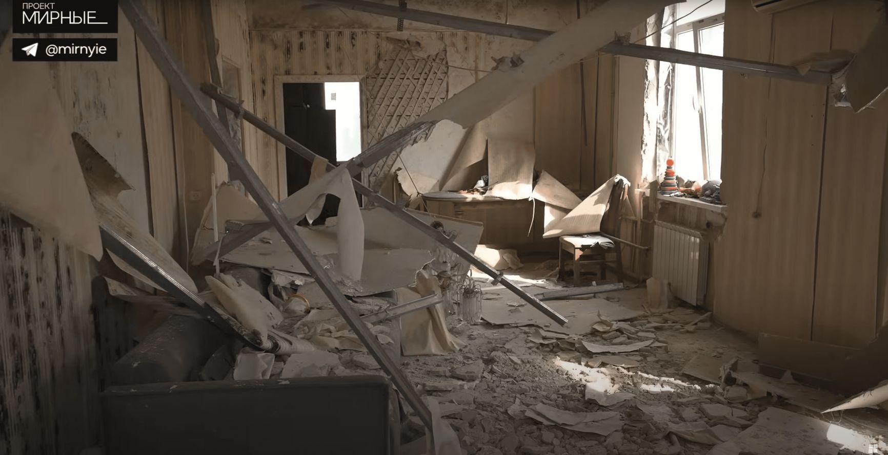 А это детская спальня. Правильной формы, также стеклопакеты поменяны. Здесь ничего не горело. Была разбита крыша, вы можете заметить, что проходила сырость, дожди, появилась плесень, но сейчас дом восстанавливают, реконструируют. Эти вещи теперь можно спокойно убрать. В наше время это не проблема. Мы видим, что собственники квартиры покидали жилье в спешке, оставив всё. Вернуться сюда и убирать — большая трагедия. Люди не могут, они готовы продать вот так, как есть. Новые жильцы должны принять это и делать свой выбор».