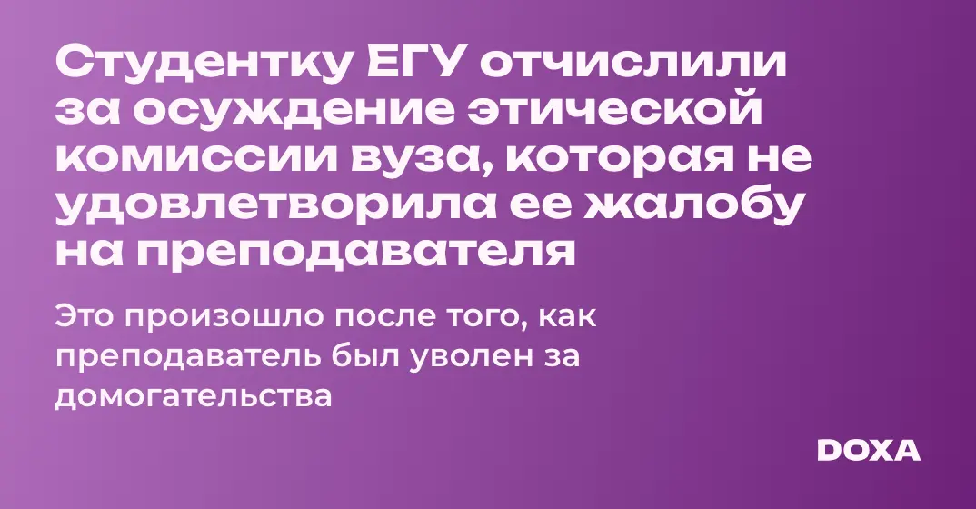 Студентку ЕГУ отчислили за осуждение этической комиссии вуза, которая не удовлетворила ее жалобу на преподавателя. Это произошло после того, как преподаватель был уволен за домогательства