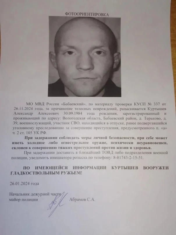 Глава Бабаевского округа Юрий Парфенов опубликовал в своей группе во «ВКонтакте» ориентировку на Куртышева, в которой говорится, что разыскиваемый мужчина — «военнослужащий, участник СВО, находящийся в отпуске, ранее подвергавшийся уголовному преследованию за совершение преступления, предусмотренного п. «а» ч. 2 ст. 105 УК РФ (убийство двух или более лиц)».