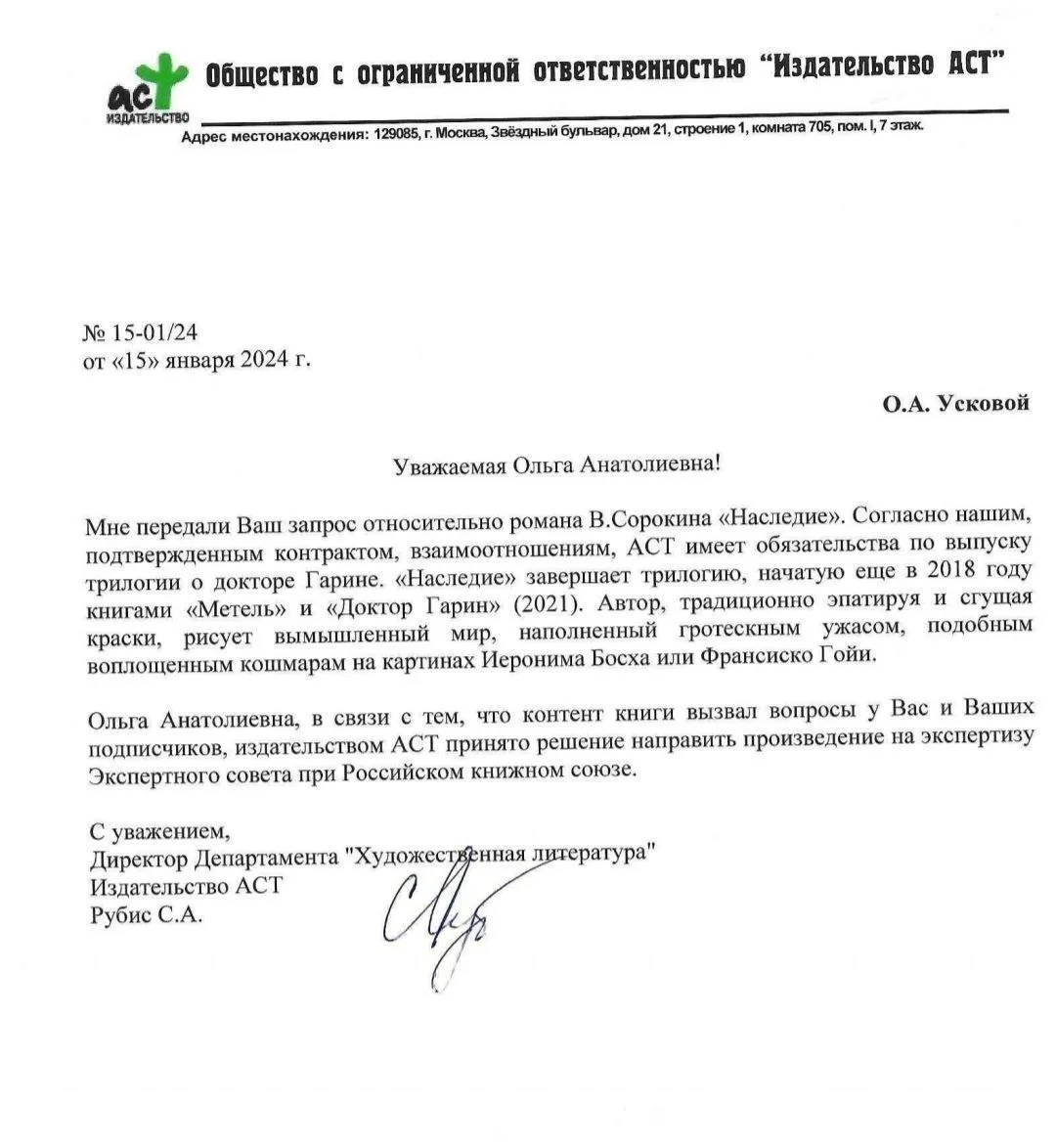Что будет после жуткого «и…», неизвестно, но тема оказалась для Усковой болезненной: она направила АСТ запрос, и 15 января из издательства пришел ответ, уверяющий, что ничего плохого писатель не сделал, но раз уж она так настаивает, АСТ пошлет книгу в Экспертный совет при Российском книжном союзе. Увы, это адресата не успокоило.
