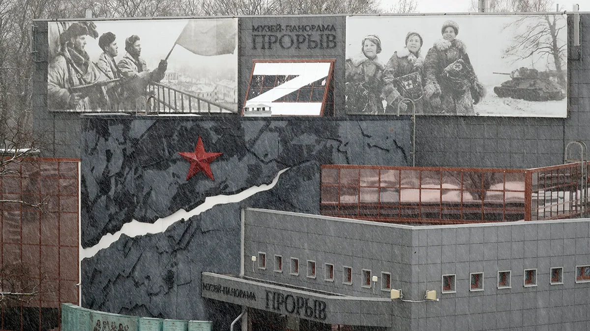 Буква Z на рекламном щите над музеем-панорамой «Прорыв», посвященном прорыву блокады Ленинграда, 6 апреля 2022 года. Фото: Анатолий Мальцев / EPA-EFE