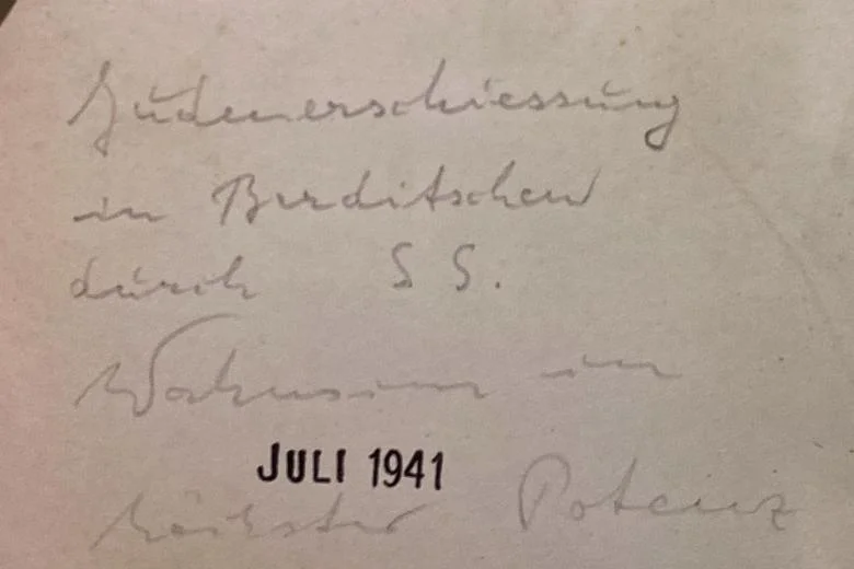 На обороте снимка рукой Матерны написано: «Конец июля 1941 года. Расстрел евреев в Бердичевской крепости» (по-немецки используется слово Zitadelle; имеется в виду монастырь-крепость ордена босых кармелитов). Внизу добавлена дата: 28 июля 1941 года. Эта находка не оставляет сомнений, где и когда случились ужасные события на фото.
