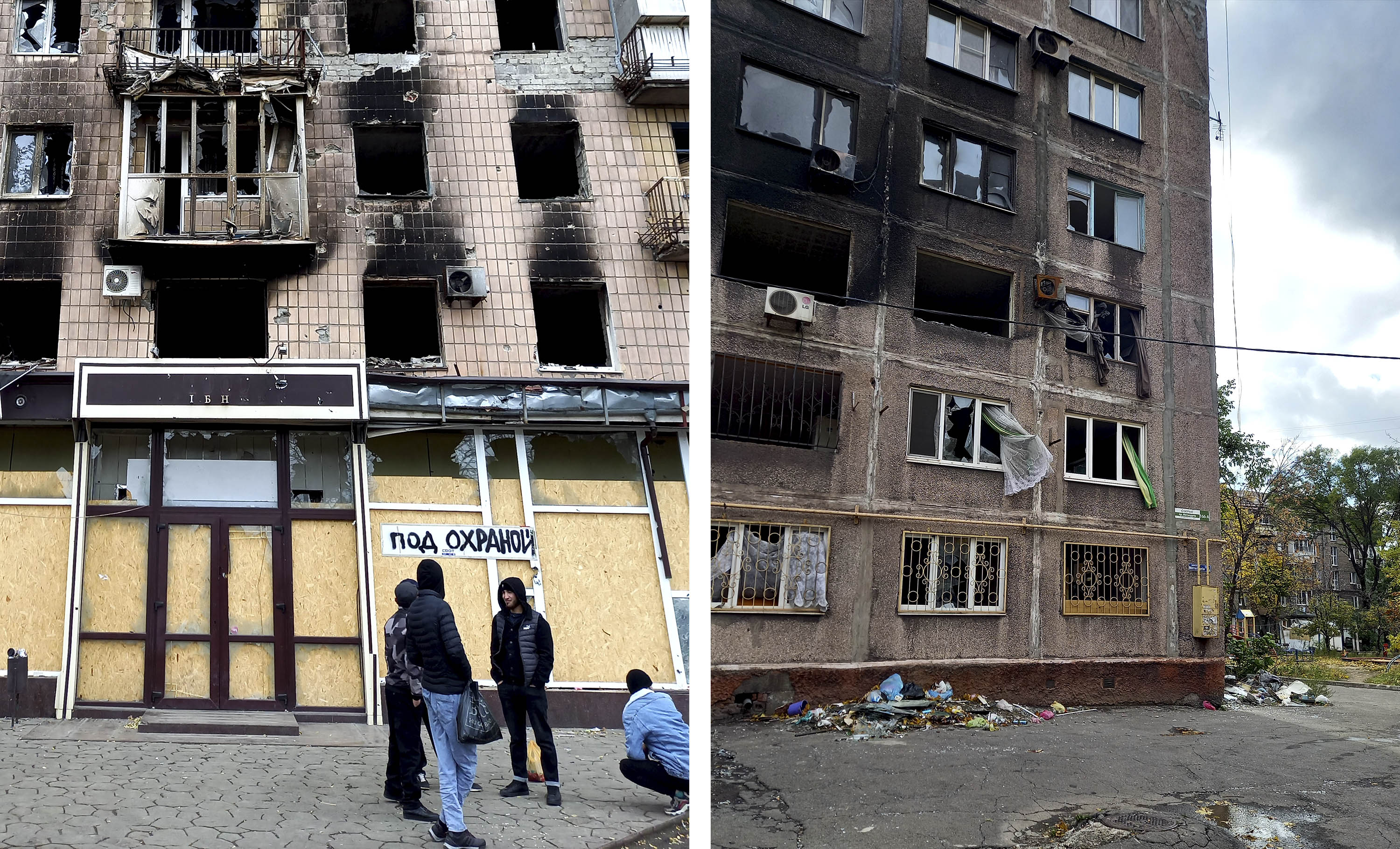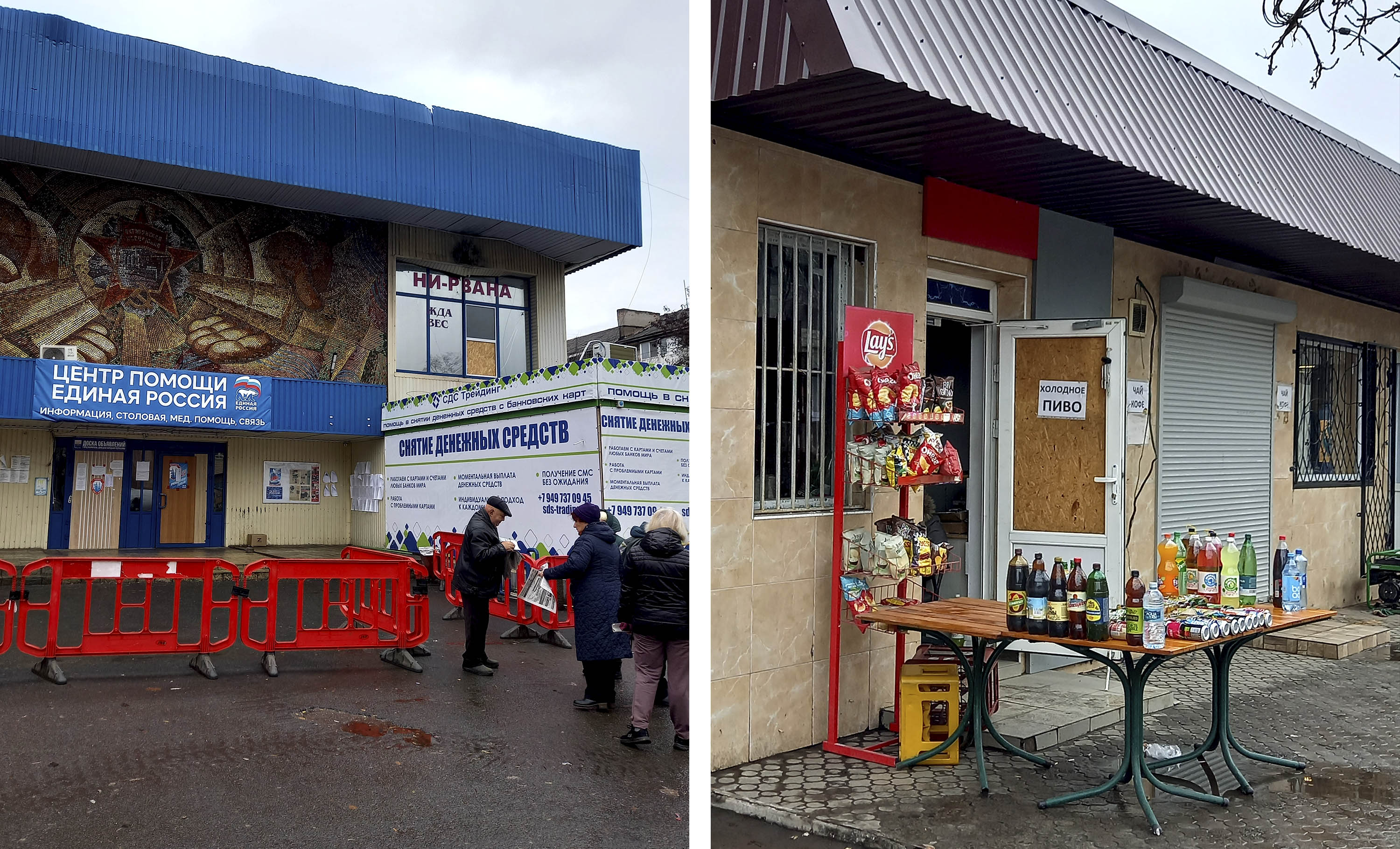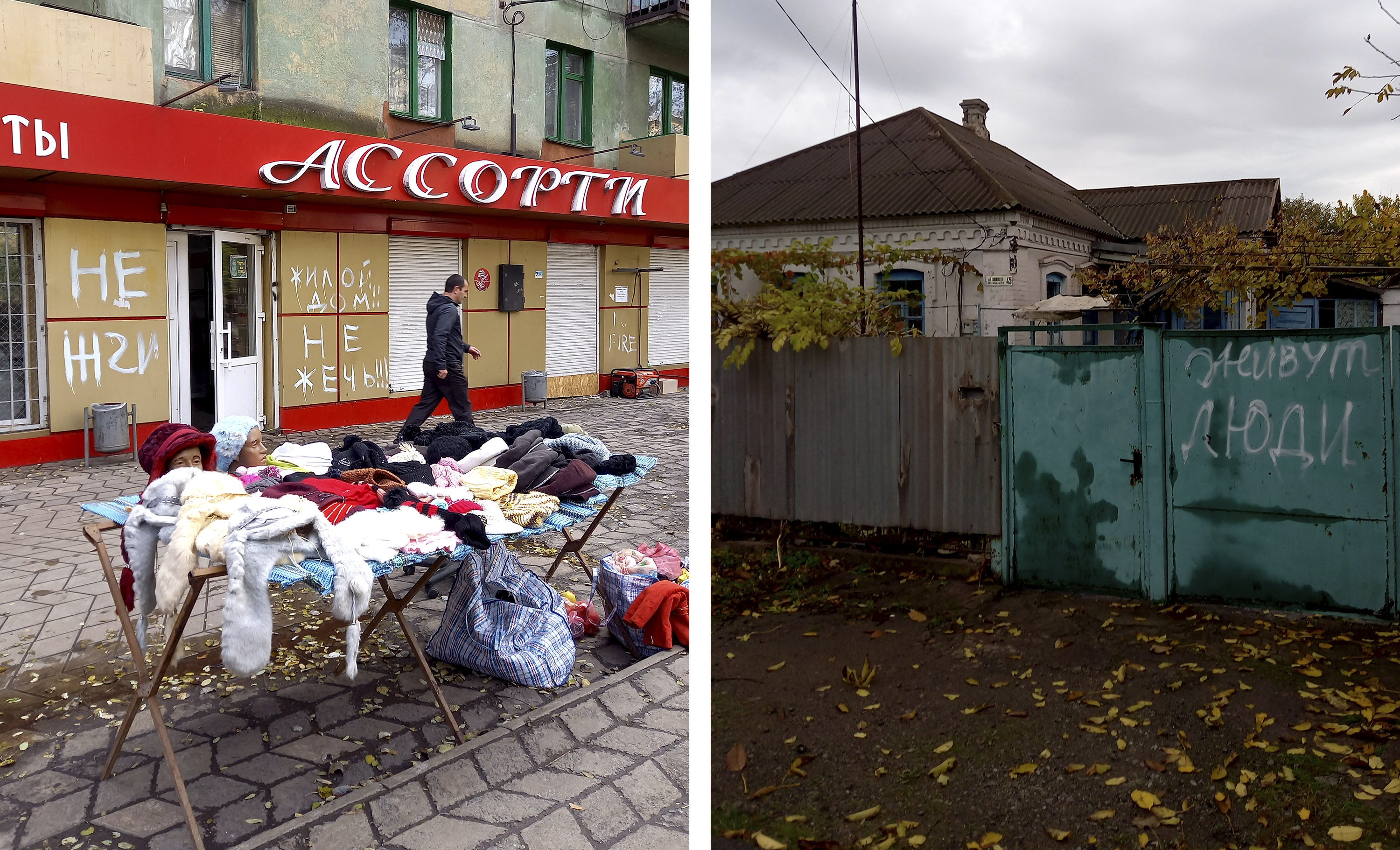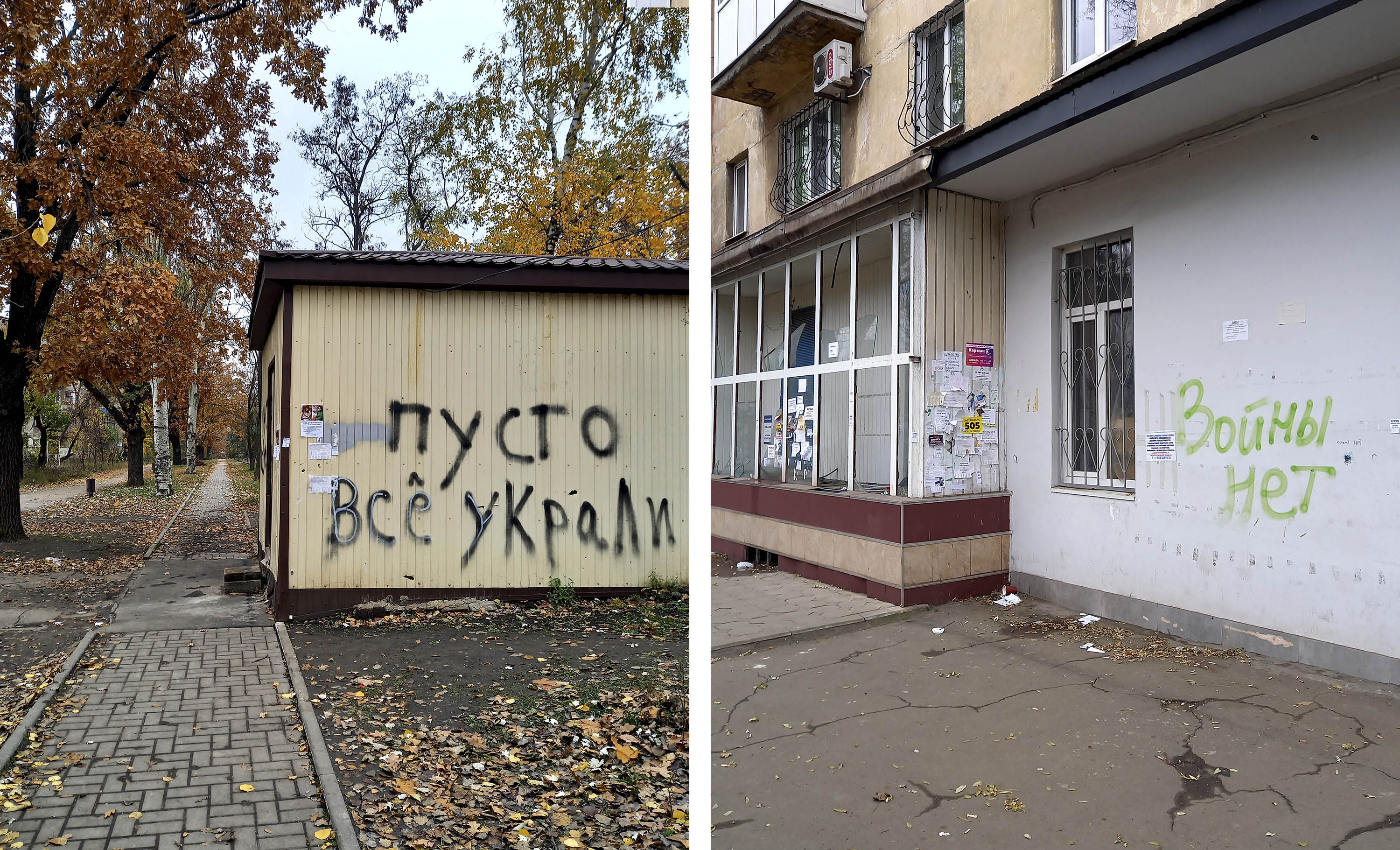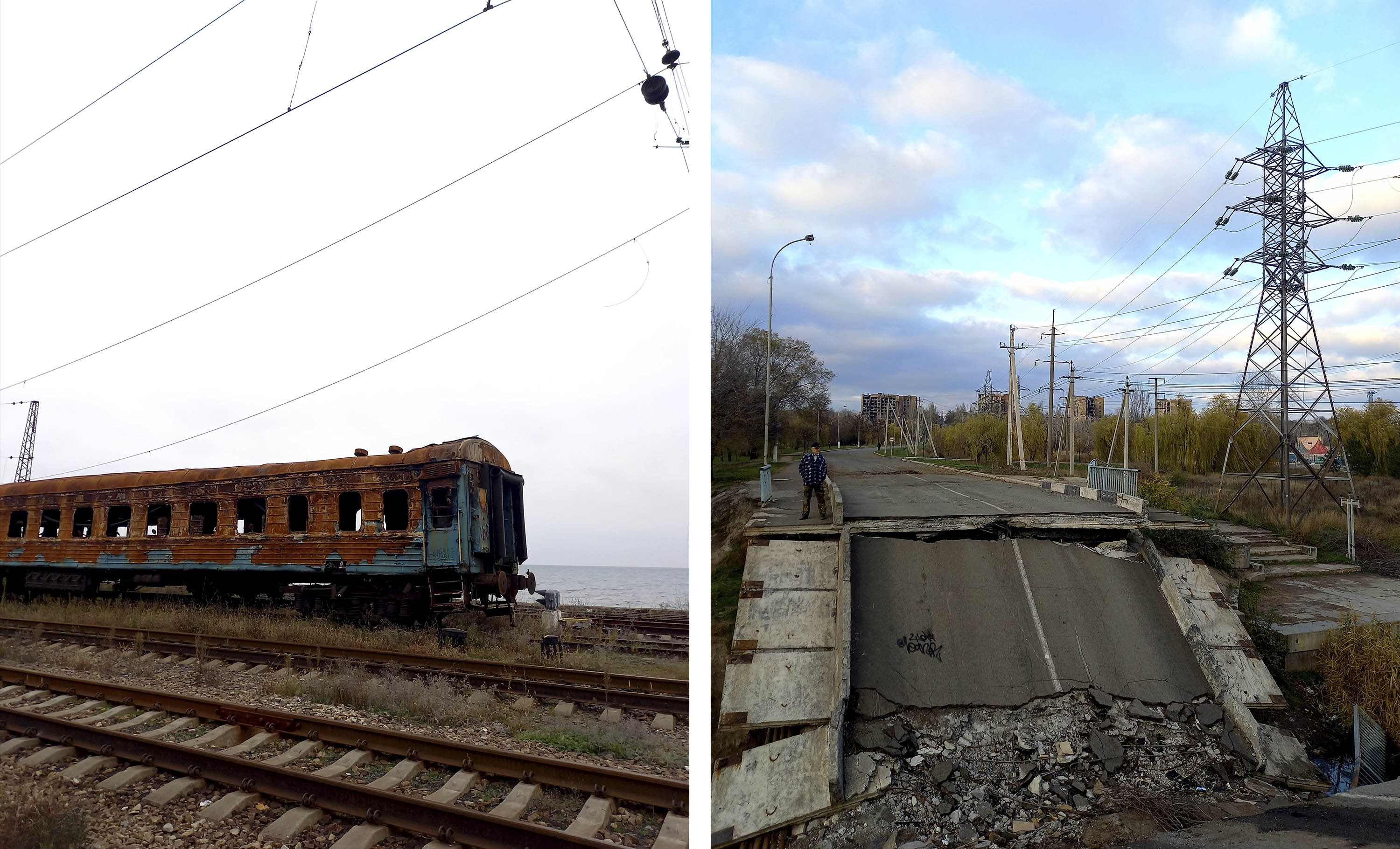 «Теоретически это направления контрнаступления — их закрыли жилмассивами, — объясняет он. — Но если обратить внимание на российские СМИ, то у них практически нет репортажей с левого берега. Потому что там жопа такая, что ой-ой-ой. Левый берег ближе всего к России, и там были самые жаркие боевые действия, оттуда Россия заходила. Поэтому там разбито почти все».