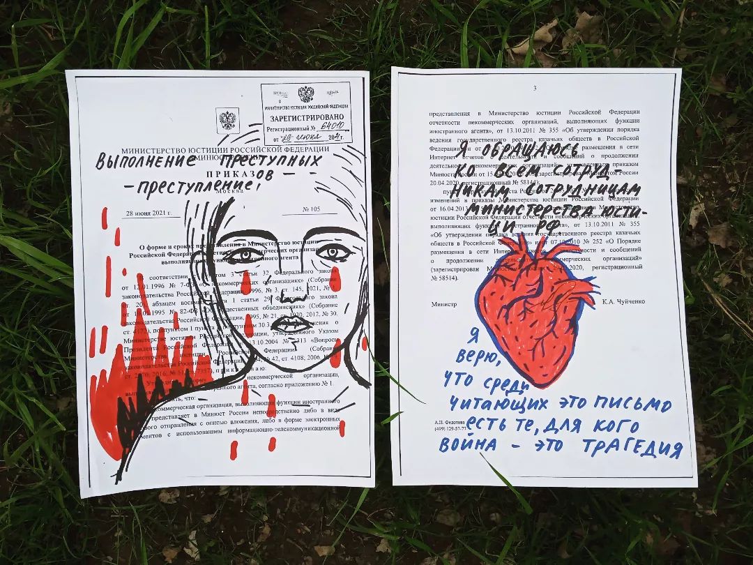 «Я выбрала художественную форму отчетов, потому что она мне понятна. На мой взгляд, язык искусства точнее и дает больше пространства для высказывания. Можно было бы написать пост о том, что я думаю о Минюсте, снять видео, но художественное высказывание предполагает больший объем, больше интерпретаций, более прямую дорожку к зрителю. Художественная форма для отчета в Минюст хороша тем, что является прямой противоположностью формальному языку, языку государственного насилия.