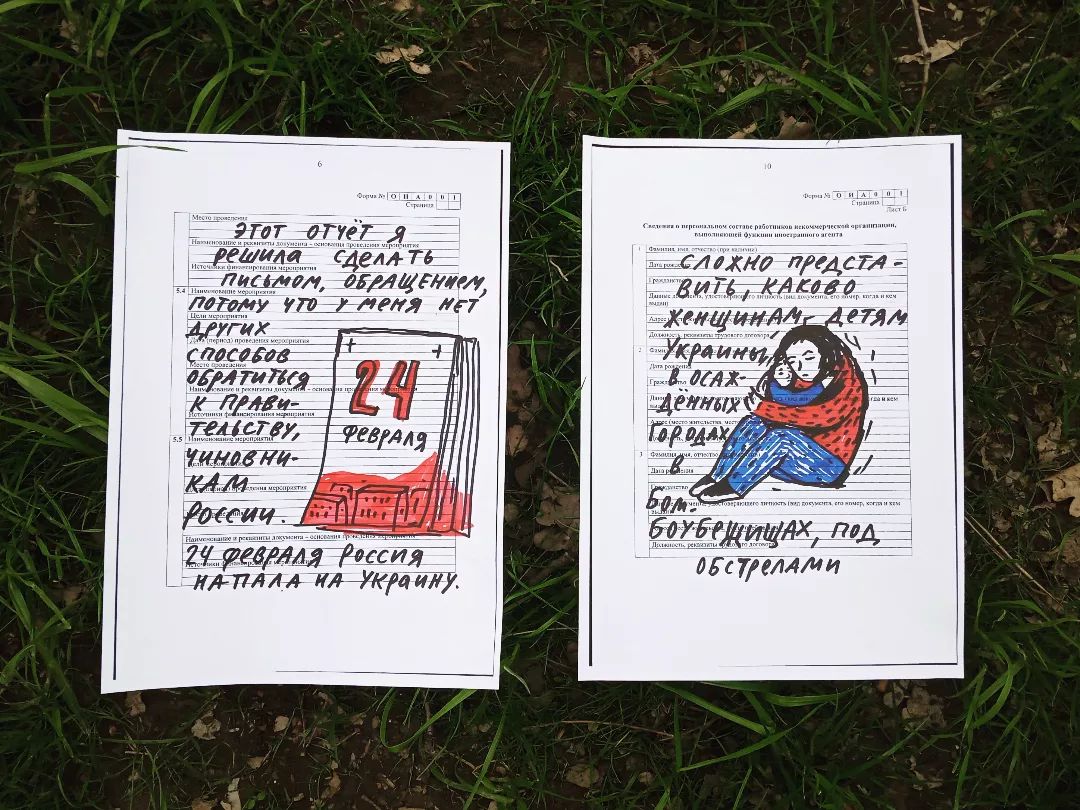 «Сложнее всего, если „иноагент“ старается выполнять все требования: это большая трата времени и сил на глупую бюрократию. Например, если я провожу поэтический вечер, мне нужно написать про него в отчете Минюсту: был ли там бюджет, откуда я получила финансирование, какую работу я выполнила, какие цели преследовала. Так я должна описать все, что я делаю. Даже если человек хотя бы раз перевел мне деньги — например за урок русского языка, — я должна отправить его данные в Минюст», — говорила писательница и художница Дарья Апахончич. В сентябре 2023 года ее оштрафовали на 40 тысяч рублей за непредоставление отчетности: Апахончич решила отказаться от исполнения «иноагентских» требований и направляла в Минюст вместо отчетов рисунки с различными высказываниями.