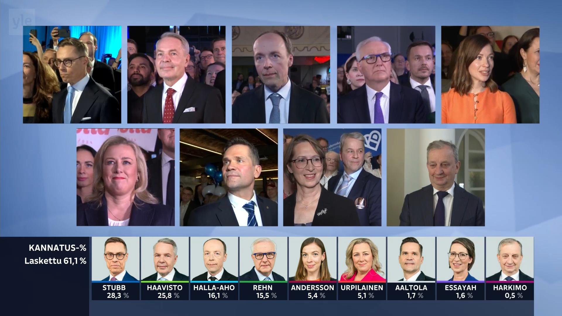 Результаты. Никто из десяти кандидатов не смог набрать 50 % голосов избирателей. Лидерами по итогу первого тура выборов стали бывший премьер-министр страны Александр Стубб (27,2 % голосов) и экс-глава МИД Финляндии Пекка Хаависто (25,8 % голосов).