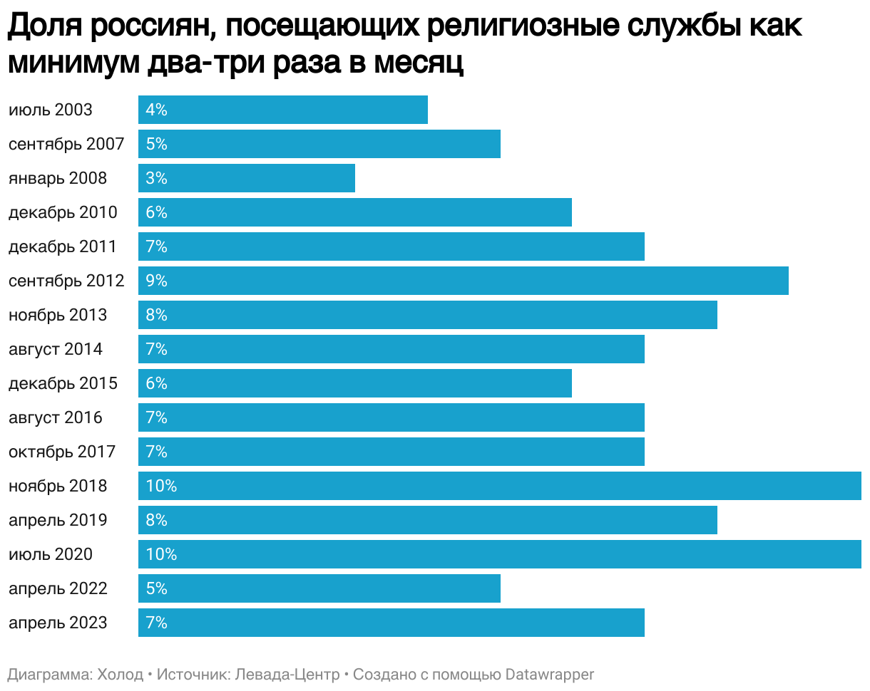 Важнейший политический актив любой религиозной институции — ее сторонники. В случае с РПЦ размеры этого ресурса принято преувеличивать. Согласно результату опроса «Левада-центра», в 2023 году 72% респондентов считали себя православными христианами. Однако, если мы будем говорить не о самоидентификации граждан, а их фактическом поведении, это число значительно снизится. Те же данные Левады показывают, что не более 7% опрошенных посещают религиозные службы хотя бы два-три раза в месяц (сделаем и дополнительную поправку на то, что часть этих 7% — мусульмане и представители других конфессий). Другой показательный пример — 39% респондентов покупали на Пасху куличи, а вот до праздничной церковной службы дошло только 5%.