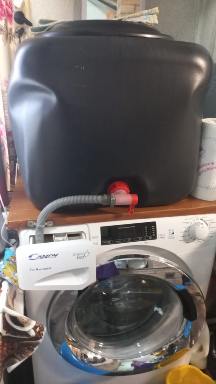 Центрального газоснабжения в доме-памятнике никогда не было. Нет и сейчас. Хорошо, что печка есть. Мыться Юлия с сыном раз в неделю ездит в квартиру к своим знакомым. Чтобы стиральная машина работала, на ней установлен пластиковый бак для воды на сто литров. Заливает воду вручную, через отделение для порошка.