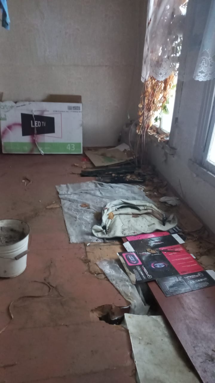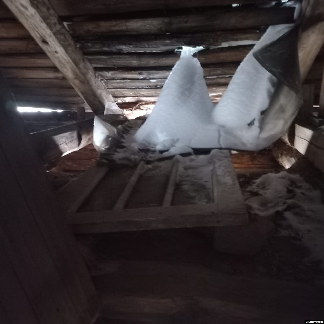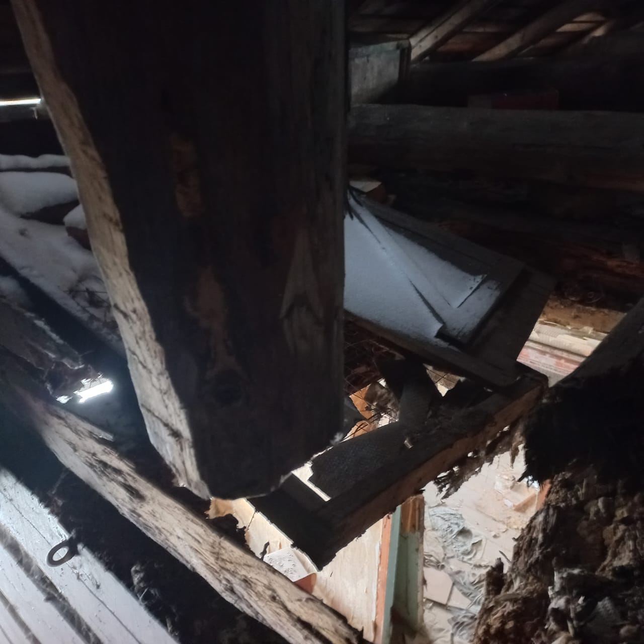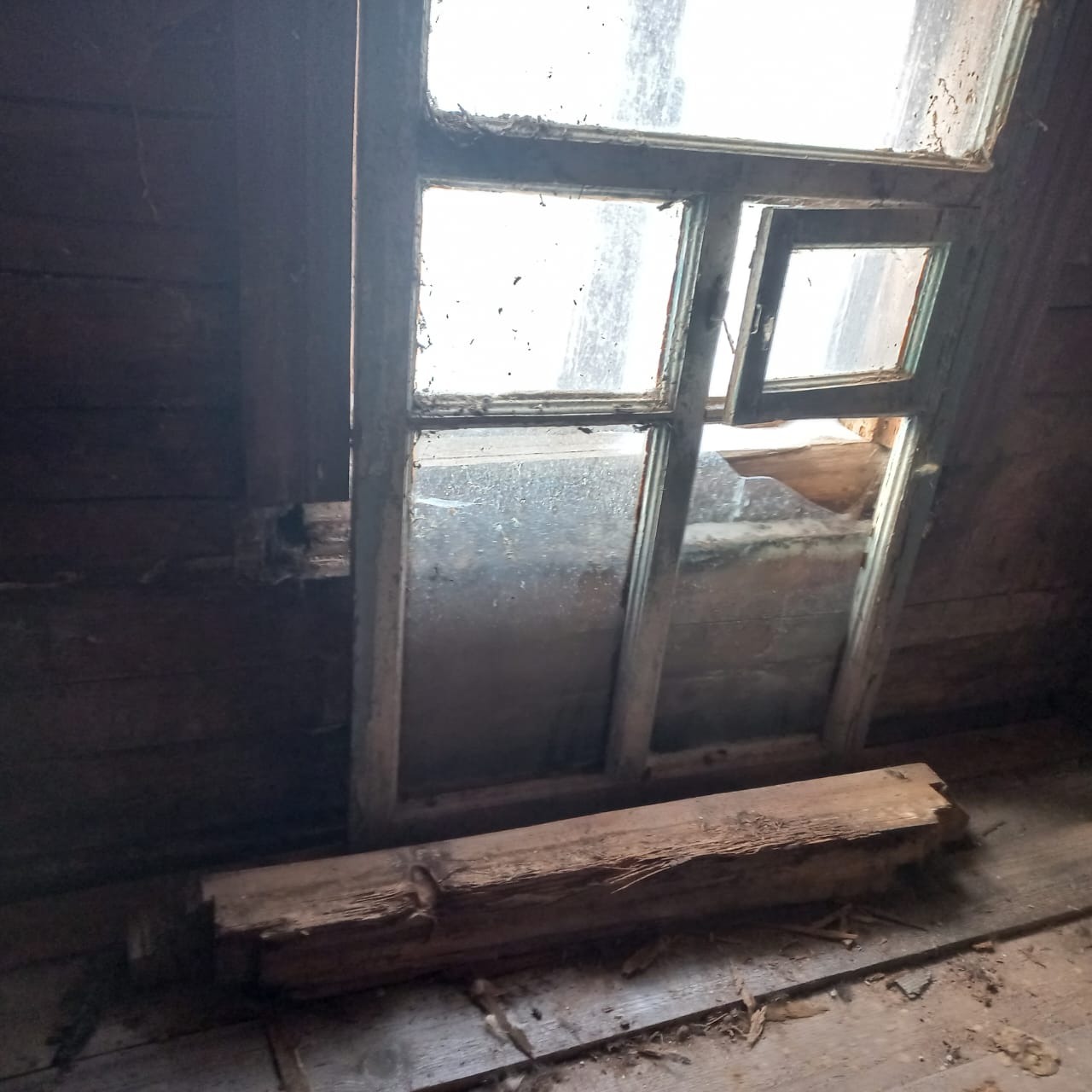 Крыша протекает, вся в дырах. На втором этаже рама сгнила и рухнула на пол.