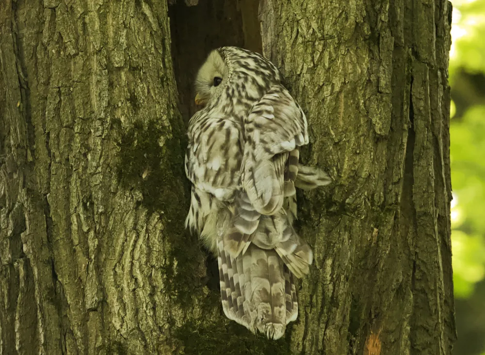 В чем же секрет притягательности воробьиного сыча? Наверное, дело в том, что зимой он часто активен днем. Впрочем, дневная активность свойственна в той или иной мере всем совам. Например, когда я в мае 2022 года фотографировал кормление птенцов длиннохвостой неясытью (Strix uralensis) в Главном ботаническом саду РАН, то часто наблюдал дневную охоту самца (фото 2). Птенцов было четверо, все хотели кушать, а самка большой активности в ловле мышей не проявляла. Впрочем, у сов так бывает часто, поскольку основная функция самки в период выкармливания — защита гнезда, к которому она не подпускает никого. Даже своего супруга, который, поймав мышь, всегда отдает ее самке, а вот она уже кормит птенцов (фото 3). Поэтому ей нужно всё время находиться неподалеку. Что касается самца, то, поскольку он является основным добытчиком корма (как для птенцов, так и для самки), ему приходится улетать на достаточно большие расстояния. И не только ночью. Ведь если охота не заладилась в темное время суток, то нужно ловить мышей днем — детки и супруга должны хорошо питаться!