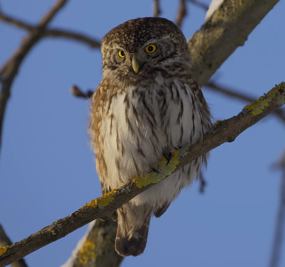 Так вот, самая маленькая сова России, воробьиный сыч (Glaucidium passerinum) обладает самым плотным оперение среди наших сов. И он, наверное, единственная сова нашей страны, чей полет совсем не бесшумный. Помню, когда я подстерегал воробьиного сыча в марте 2023 года всё в том же Главном ботаническом саду, то в какой-то момент отвлекся, и птица, слетев в верхушки куста сирени, быстро пролетела мимо моего лица, а потом села всего в трех метрах от меня (фото 4). В тот момент я четко слышал шум крыльев сыча. А обладающие более чутким слухом мыши и мелкие птицы (на которых сыч тоже охотится) слышат этот шум на куда большем расстоянии.