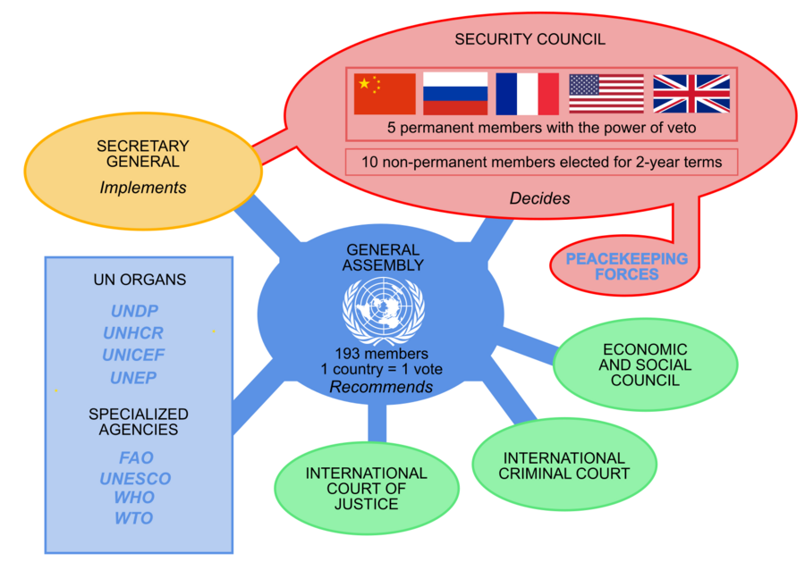 Эти пять стран получили статус постоянных членов Совета Безопасности и право накладывать вето на все решения. Предпринимать реальные действия, например использовать миротворческие контингенты, ООН могла лишь в случае согласия всех членов Совбеза.