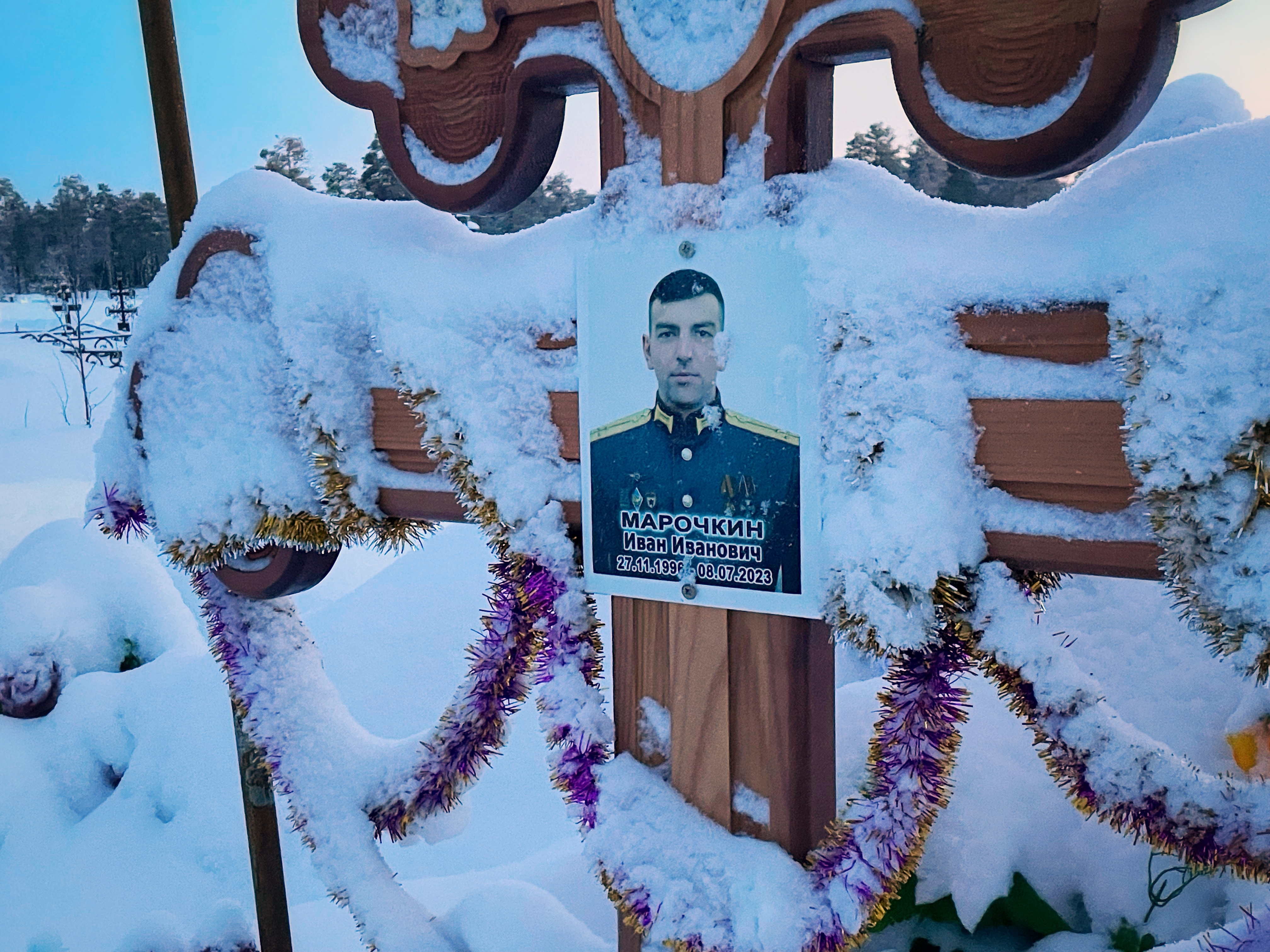 Кто-то из погибших в Украине похоронен на так называемой "Аллее славы". Кто-то рядом со своими родственниками. Могила офицера Ивана Марочкина на окраине кладбища украшена к Новому году гирляндами.