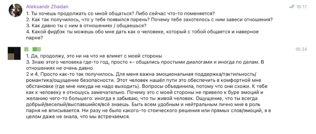 Секреты от партнерши. В какой-то момент Александр отказывается от общения с большинством девушек, остаются лишь четыре (в треде он пишет, что «перевел остальных на мьют» — то есть, видимо, не попрощавшись просто перестал отвечать. Не очень-то вежливо). Вскоре он начинает строить отношения с Кариной. Но даже тогда он не сразу признается ей, что в переписке за него общается бот. Лично для меня это выглядит как отношения, начавшиеся с обмана.